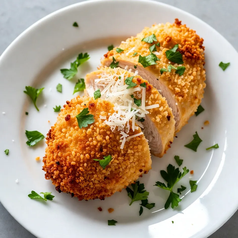 - 2 boneless, skinless chicken breasts - 1 cup grated Parmesan cheese - 1 cup panko breadcrumbs - 1 teaspoon garlic powder - 1 teaspoon Italian seasoning - 1/2 teaspoon salt - 1/2 teaspoon ground black pepper - 2 large eggs - 1 tablespoon Dijon mustard - Fresh parsley, finely chopped (for garnish, optional) To create the perfect Air Fryer Parmesan Crusted Chicken, gather your ingredients first. You will need boneless, skinless chicken breasts. These are easy to cook and stay juicy. Grated Parmesan cheese brings a rich, savory flavor. Panko breadcrumbs add the crunch we crave. Next, we have spices and seasonings. Garlic powder gives a nice kick. Italian seasoning adds depth. A bit of salt and black pepper brings out the flavors. For the binding ingredients, you need eggs and Dijon mustard. They help the breadcrumbs stick well. You can also use fresh parsley for garnish. It adds color and freshness to the dish. Once you have all your ingredients, you’re ready to make a crispy delight that everyone will love! {{ingredient_image_2}} - Preheat the air fryer to 380°F (190°C). This step takes about 5 minutes. - Set the air fryer to the optimal setting for even cooking. - In a shallow dish, mix 1 cup of grated Parmesan cheese with 1 cup of panko breadcrumbs. - Add 1 teaspoon of garlic powder, 1 teaspoon of Italian seasoning, 1/2 teaspoon of salt, and 1/2 teaspoon of black pepper. Mix well. - In a separate bowl, whisk 2 large eggs and 1 tablespoon of Dijon mustard until smooth. - Pat the chicken breasts dry with paper towels. This helps the crust to be extra crispy. - Dip each chicken breast into the egg mixture, coating it fully. Let excess drip off. - Dredge the chicken in the breadcrumb mixture. Press gently to help the crust stick. - Place the breaded chicken breasts in the air fryer basket. Leave space between pieces for hot air. - Cook at 380°F (190°C) for 12-15 minutes. Flip the chicken halfway through for even cooking. - Check the internal temperature; it should reach 165°F (75°C) for safety. - Remove the chicken and let it rest for a few minutes before slicing. This keeps it juicy. To get that perfect crispy texture, you must pat the chicken dry. This step removes moisture that can make the crust soggy. Use paper towels and press gently. Next, space is key when placing chicken in the air fryer. If the chicken breasts touch, they won’t cook evenly. Keep a little room between them. This allows hot air to flow around each piece, creating a nice, crispy crust. Always check the internal temperature of the chicken. Use a meat thermometer to ensure it reaches 165°F (75°C). This guarantees safety and juiciness. Adjust your cooking time based on the thickness of the chicken breasts. Thicker pieces may need a few extra minutes. Thin breasts will cook faster, so keep an eye on them to avoid overcooking. Pair your chicken with vibrant side dishes. A fresh side salad or steamed veggies adds color and nutrition. For presentation, slice the chicken into medallions. Serve it on a rustic wooden cutting board. A sprinkle of fresh parsley adds a pop of green and enhances the dish's visual appeal. Enjoy it warm for the best taste! Pro Tips Dry Chicken Breasts: Make sure to pat the chicken breasts dry with paper towels before breading. This helps the coating stick better and results in a crispier texture. Don’t Overcrowd the Air Fryer: Cook the chicken in batches if necessary. Overcrowding can lead to uneven cooking and less crispy results. Check Internal Temperature: Use a meat thermometer to ensure the chicken reaches an internal temperature of 165°F (75°C) for safe eating and optimal juiciness. Experiment with Seasonings: Feel free to customize the breadcrumb mixture with your favorite herbs and spices for a unique flavor profile. {{image_4}} You can make this dish even better with extra flavors. Adding herbs like thyme or oregano brightens the taste. You might also try spices like paprika or cayenne for a kick. Mixing in different cheeses adds unique notes. Cheddar brings sharpness, while mozzarella adds creaminess. Feel free to mix and match according to your taste! If you need a gluten-free option, use almond flour or gluten-free breadcrumbs. These substitutes give a nice crunch without the gluten. You can also try crushed crackers or nuts for a different texture. Crushed cornflakes add a fun crunch, while nuts give a rich flavor. Experiment with what you have on hand! If you don’t have an air fryer, you can bake the chicken. Preheat your oven to 400°F (200°C) and bake for about 20-25 minutes. Make sure to flip the chicken halfway for even browning. You can also pan-fry the chicken in a skillet. Heat oil over medium heat and cook each side until golden. This method gives a lovely crispy edge that you will enjoy. To store leftovers, let the chicken cool first. Place it in an airtight container. This helps keep it fresh. You can store the chicken in the fridge for up to four days. If you want to enjoy it later, make sure to keep it sealed tight. The best way to reheat chicken is in the air fryer. Set it to 350°F (175°C). Heat for about 5 to 7 minutes. This method keeps the chicken crispy. You can also use an oven. Place it on a baking sheet and warm it at 350°F (175°C) for 10 minutes. Avoid using a microwave, as it can make the chicken soggy. To freeze baked chicken, let it cool completely. Wrap each piece in plastic wrap, then in foil. This prevents freezer burn. You can freeze the chicken for up to three months. To thaw, place it in the fridge overnight. Reheat as mentioned above. This way, you’ll keep that crispy texture! Air Fryer Parmesan Crusted Chicken lasts up to 3 days in the fridge. Store it in an airtight container. For the best taste, eat it within two days. You can enjoy the chicken warm or cold in salads or sandwiches. Yes, you can use chicken thighs! They will be juicier and still crispy. Adjust the cooking time. Cook thighs for about 15-18 minutes. Always check t