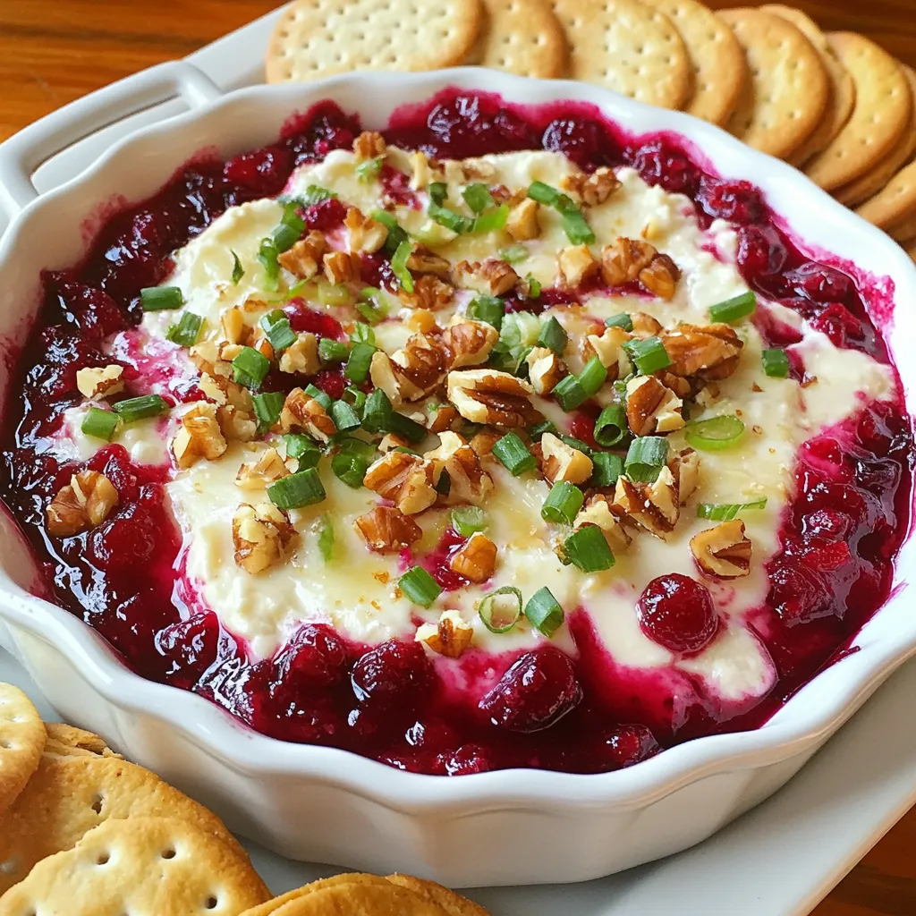 A warm and creamy dip featuring the delightful combination of cream cheese, cranberry sauce, and mozzarella, perfect for gatherings.