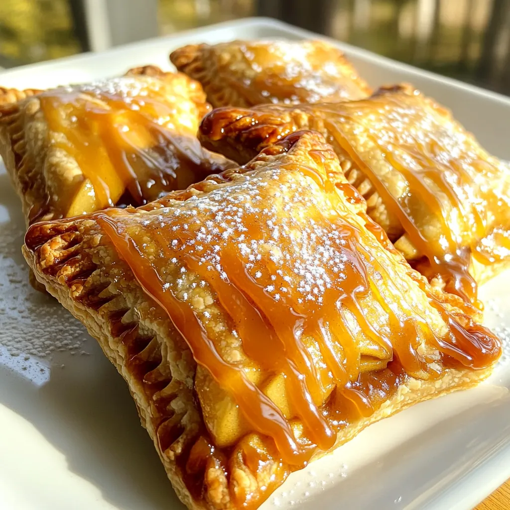 Arrange the hand pies on a parchment-lined baking sheet, giving them space. Bake them in the preheated oven for about 20 to 25 minutes. They should turn golden brown and the crust should be flaky. Once done, let them cool slightly before serving. Enjoy these delicious treats warm with extra caramel sauce if you like!