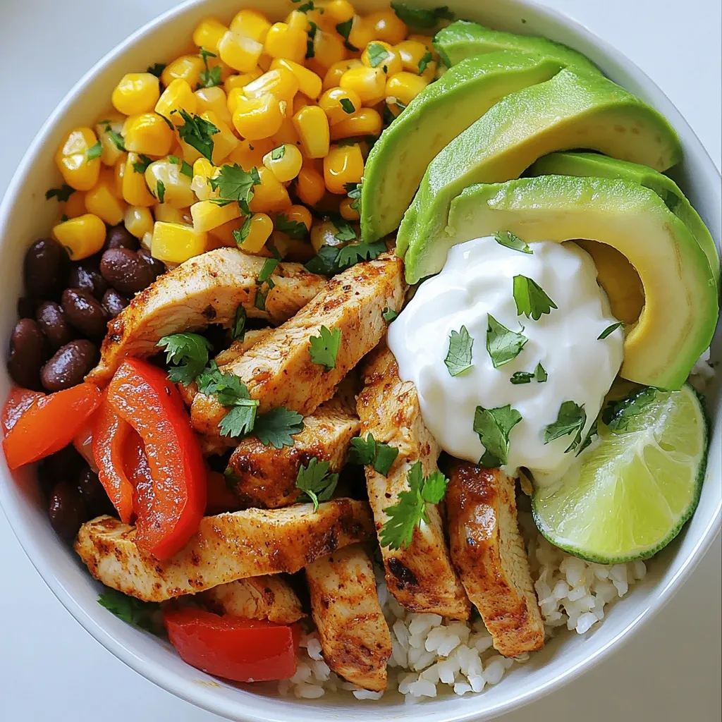 A vibrant and flavorful burrito bowl featuring marinated chicken, colorful vegetables, and nutritious toppings.