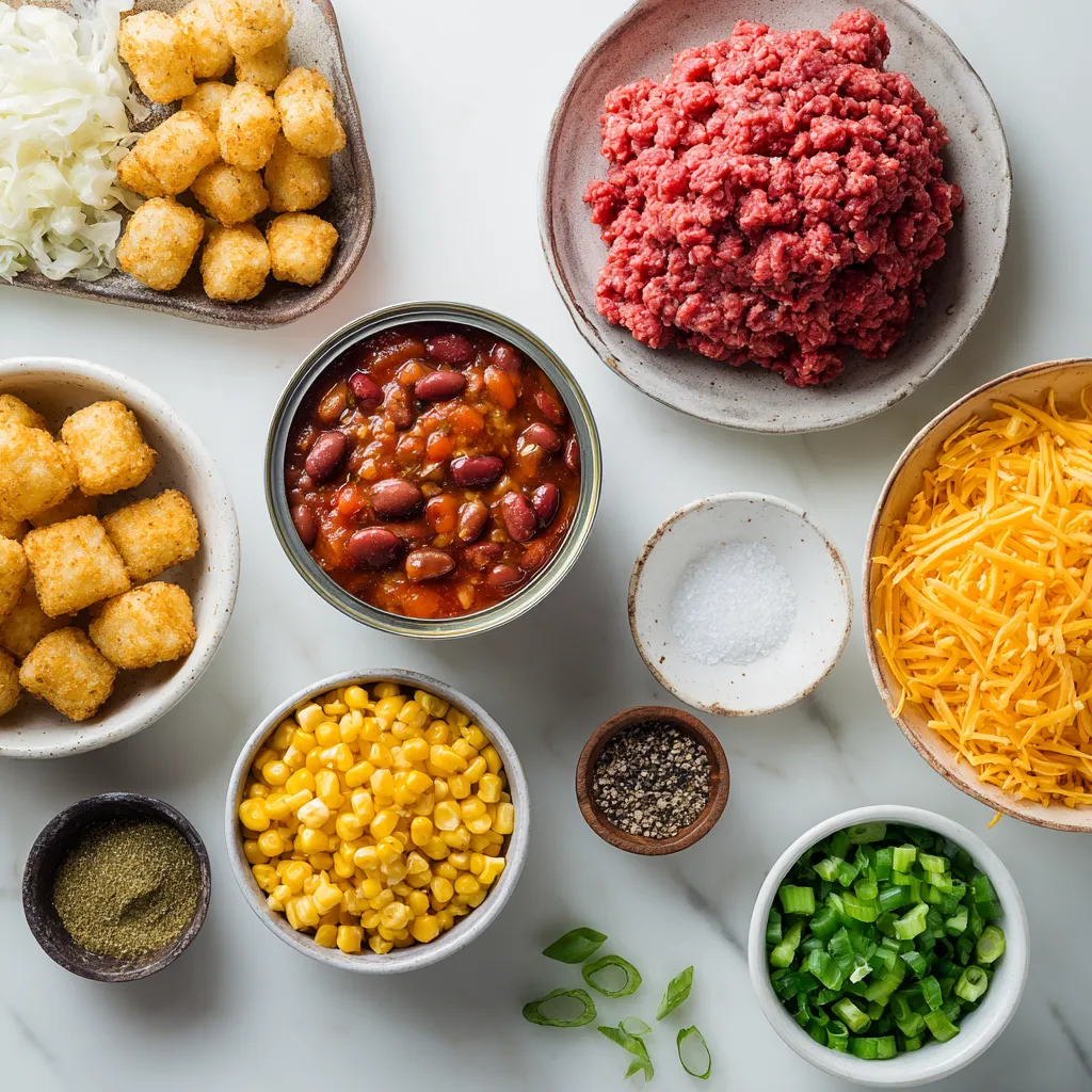 Chili Cheese Tater Tot Casserole starts with hearty ingredients. Ground beef or turkey gives protein and flavor. Chili beans and diced tomatoes add a rich, saucy base. Corn brings sweetness to balance the spice. Taco seasoning adds a kick. The cheese melts beautifully on top. Tater tots create a crispy layer, making each bite delightful.