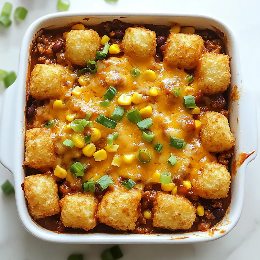 - 1 lb ground beef or turkey - 1 can (15 oz) chili beans in sauce - 1 can (15 oz) diced tomatoes, drained - 1 cup frozen or canned corn - 1 packet taco seasoning mix - 2 cups shredded cheddar cheese, divided - 2 cups frozen tater tots - Salt and black pepper to taste - Cooking spray for greasing Chili Cheese Tater Tot Casserole starts with hearty ingredients. Ground beef or turkey gives protein and flavor. Chili beans and diced tomatoes add a rich, saucy base. Corn brings sweetness to balance the spice. Taco seasoning adds a kick. The cheese melts beautifully on top. Tater tots create a crispy layer, making each bite delightful. - ½ cup chopped green onions - Sour cream or guacamole For those who love a fresh touch, chopped green onions brighten the dish. A dollop of sour cream or guacamole gives creaminess. These toppings enhance the flavors and make the dish even more inviting. - 9x13 inch baking dish - Large skillet - Spatula You will need a 9x13 inch baking dish for the casserole. A large skillet cooks the meat and combines the ingredients. A spatula helps mix and serve. These tools make the cooking process smooth and simple. {{ingredient_image_2}} Set your oven to 400°F (200°C). While it heats, grab a 9x13 inch baking dish. Spray it lightly with cooking spray to keep everything from sticking. In a large skillet over medium heat, add 1 lb of ground beef or turkey. Cook it until it turns brown. Use a spatula to break it apart while it cooks. Once it is browned, drain any excess fat from the skillet. Stir in 1 can of chili beans (with sauce), 1 can of drained diced tomatoes, and 1 cup of corn. Add a packet of taco seasoning mix, plus a sprinkle of salt and black pepper. Mix it all well and let it simmer for about 5 minutes. This step helps the flavors blend nicely. Carefully pour the chili mixture into the prepared baking dish. Spread it evenly to form a base layer. This will hold all the deliciousness inside. Sprinkle 1 cup of shredded cheddar cheese evenly over the chili mixture. This cheesy layer adds great flavor and richness. Take 2 cups of frozen tater tots and arrange them on top of the cheese. Lay them out in a single layer. This helps them get crispy while baking. Place the baking dish in the oven. Bake for 25-30 minutes. Look for the tater tots to turn golden brown and crispy on the outside. Once the tater tots are done, pull the casserole out of the oven. Sprinkle the remaining 1 cup of shredded cheddar cheese on top. Return the dish to the oven for an extra 5 minutes. This makes the cheese melt and bubble beautifully. Let the casserole cool for a few minutes after baking. Garnish it with chopped green onions for a fresh touch. Serve it warm and enjoy! If you want to swap ground meat, try ground chicken or lentils. Both work well. For a vegan option, use plant-based ground meat or mushrooms. You can also use nutritional yeast instead of cheese for a creamy texture. To ensure even cooking of tater tots, spread them out well in the dish. Do not crowd them. This helps them get crispy all around. For flavor enhancement, add a dash of hot sauce or a sprinkle of garlic powder. This will give your casserole a tasty kick. Pair your casserole with a simple green salad or some steamed veggies. This adds freshness to your meal. For presentation, serve right from the baking dish. Use a large spoon to scoop portions. A dollop of sour cream or guacamole on top makes it even better. Enjoy every bite! Pro Tips Use Leftover Chili: If you have leftover chili, feel free to use it in place of the canned chili beans for an even heartier dish. Customize Your Toppings: Add your favorite toppings like jalapeños, black olives, or even crushed tortilla chips for extra crunch. Make It Spicy: If you like heat, consider adding diced jalapeños or a splash of hot sauce to the meat mixture. Storage Tips: This casserole stores well in the fridge for up to 3 days. Reheat in the oven for best results. {{image_4}} Want to add some heat? Try adding jalapeños or hot sauce. You can mix chopped jalapeños into the meat mixture. For extra kick, drizzle hot sauce over the top before baking. Adjust the amount to fit your spice level. This adds a nice zing to every bite. If you want a lighter dish, use leaner meat like ground turkey. You can also swap in veggies for the meat. For example, use black beans or lentils. This makes it healthier while still tasty. You can add more corn or even spinach for extra nutrients. Cheese is a big part of this dish. While cheddar is classic, feel free to experiment. Try using pepper jack for a spicy twist. Mozzarella gives a milder flavor and great melt. You can also mix different cheeses together. This adds depth to the flavor and makes it fun to create. To store leftovers, let the casserole cool first. Place it in an airtight container. This keeps the flavors fresh. You can store it in the fridge for up to five days. When ready to eat, just reheat a portion. Freezing this casserole is simple. First, let it cool completely. Then, wrap it tightly in plastic wrap or foil. You can also use a freezer-safe container. It will last up to three months in the freezer. When you're ready to enjoy it, thaw it in the fridge overnight. For reheating, preheat your oven to 350°F (175°C). Take the casserole out of the fridge or freezer. If frozen, let it thaw first. Cover it with foil to keep it moist. Bake for about 25-30 minutes or until heated through. You can also microwave single servings for quick meals. Just heat in 1-minute intervals until warm. Chili Cheese Tater Tot Casserole can last about 3 to 5 days in the fridge. Store it in an airtight container. This keeps it fresh and tasty. Before serving, check for any signs of spoilage. If it smells off or looks strange, it’s best to toss it. Yes, you can make this dish ahead of time. Prepare the casserole and cover it tightly with foil. You can store it in the fridge for up to 24 hours before baking. When you are ready to bake, just ad