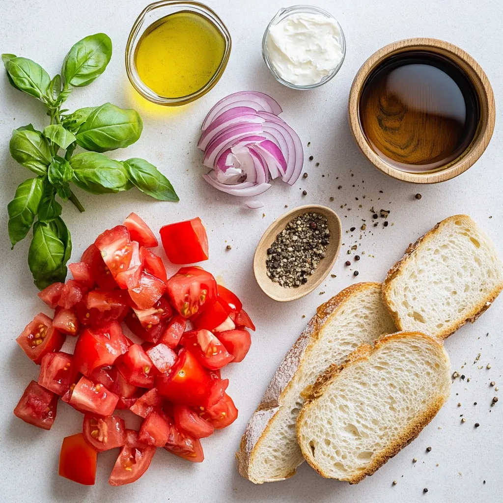 First, gather your fresh ingredients. Dice four ripe tomatoes into small chunks. Chop one cup of red onion finely. Mince one clove of garlic. Lastly, chop half a cup of fresh basil leaves.