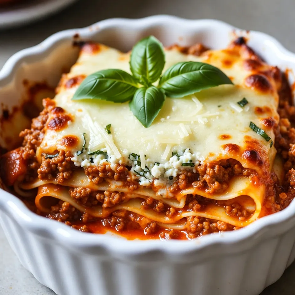 A delicious and hearty lasagna made with layers of meat sauce, ricotta, and mozzarella cheese.