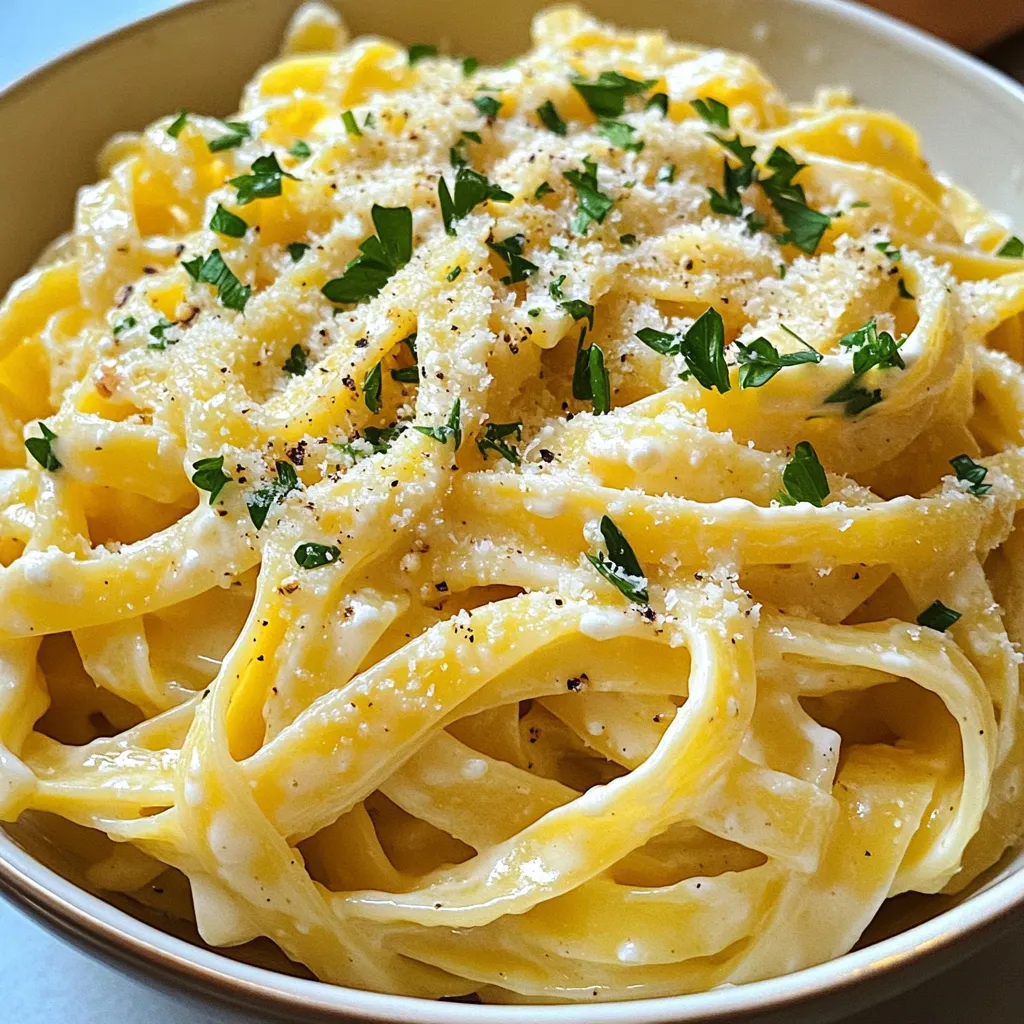 - 8 oz fettuccine pasta - 1 cup cottage cheese - 1/2 cup grated Parmesan cheese - 1/2 cup heavy cream - 3 cloves garlic, minced - 1 tablespoon olive oil - 1 teaspoon Italian seasoning - Salt and black pepper to taste - Fresh parsley, chopped (for garnish) - Additional grated Parmesan cheese (for topping) - Calories: 350 - Protein: 18g - Fat: 20g - Carbohydrates: 30g - Fiber: 2g - Sugar: 2g The ingredients for Cottage Cheese Alfredo Pasta are simple yet flavorful. You start with fettuccine, the star of this dish. It pairs well with the creamy sauce. Cottage cheese brings richness and protein. Parmesan adds a nice salty kick. Heavy cream makes the sauce velvety smooth. Garlic gives it a lovely aroma. Olive oil adds depth and helps cook the garlic just right. Italian seasoning brings a blend of herbs that tie everything together. You can also get creative with add-ins. Fresh parsley not only brightens the dish but adds color. A sprinkle of extra Parmesan makes it even better. Each serving of this meal packs a punch with protein and flavor while being a delightful treat. It’s quick to prepare, making it great for busy weeknights. Enjoy the balance of taste and nutrition in every bite! First, grab a large pot and fill it with water. Add a good amount of salt. Bring the water to a rolling boil. Once boiling, gently add the fettuccine pasta. Cook it according to the package instructions until it is al dente. This usually takes about 8 to 10 minutes. After cooking, drain the pasta in a colander. Remember to keep about a cup of the pasta water. Set the pasta aside for now. Next, take a medium saucepan and heat a tablespoon of olive oil over medium heat. When the oil is warm, add three minced garlic cloves. Stir the garlic for about one minute. You want the garlic to smell great, but don’t let it brown. If it turns brown, it might taste bitter. Now it’s time to make the sauce. In a blender, combine one cup of cottage cheese, half a cup of grated Parmesan cheese, and half a cup of heavy cream. Add one teaspoon of Italian seasoning and a pinch of salt and black pepper. Blend this mixture on high until it becomes smooth and creamy. This step makes the sauce rich and thick. Pour the creamy sauce into the saucepan with the sautéed garlic. Stir the mixture gently over low heat. This warms everything up nicely. If your sauce seems too thick, add some of the reserved pasta water. Keep stirring until the sauce reaches your desired consistency. Finally, add the cooked fettuccine to the sauce. Toss it gently to coat all the pasta well. Let it cook for another 2 to 3 minutes to blend the flavors. Serve it hot, topped with extra grated Parmesan and fresh parsley for a lovely finish. To make great pasta, start with enough water. Fill a large pot to the brim. Add a good amount of salt to the water. This step helps flavor the pasta. Bring the water to a rolling boil before adding the fettuccine. Stir the pasta to prevent it from sticking. Cook the pasta until it is al dente, which means firm to the bite. This usually takes about 8 to 10 minutes. Always check the package for exact cooking times. When done, drain the pasta but save some water. You might need it for the sauce later. Sometimes the sauce can be too thick. If that happens, don’t worry! You can fix it easily. Use the reserved pasta water to thin the sauce. Add it a little at a time. Stir well until the sauce is just right for you. The perfect sauce should coat the pasta without being runny. If the sauce is too thin, let it cook longer. It will thicken as it heats. To make your meal even better, try adding extra flavors. Fresh herbs like basil or thyme can brighten the dish. You can also add a pinch of red pepper flakes for heat. If you want to switch things up, use ricotta cheese instead of cottage cheese. For a richer taste, try using cream cheese. Also, feel free to add veggies like spinach or mushrooms for more nutrition. {{image_4}} You can easily add protein to your Cottage Cheese Alfredo Pasta. Consider grilled chicken or shrimp. Both options boost flavor and nutrition. For chicken, grill or pan-sear it until golden. Slice it thin and mix it into the pasta. For shrimp, sauté in olive oil until pink. Toss them in right before serving for a tasty twist. If you want a vegetarian option, replace the chicken and shrimp with veggies. Broccoli, spinach, or bell peppers work well. Sauté your veggies in the olive oil before adding the garlic. This adds color and nutrition. For a vegan version, swap cottage cheese with a vegan cream cheese. Use nutritional yeast instead of Parmesan. This keeps the dish creamy and delicious. While fettuccine is great, feel free to try other pasta shapes. Penne, rotini, or farfalle can add fun. Each shape holds the sauce differently. Penne has ridges that catch the sauce well. Rotini spirals trap the creamy goodness. Choose what you like best for a personal touch. To keep your Cottage Cheese Alfredo Pasta fresh, store it in an airtight container. Let the pasta cool before sealing it. This helps prevent moisture buildup. Place it in the fridge. It will stay good for about three days. If you have extra sauce, store it separately. This way, the pasta won't get soggy. When you are ready to enjoy leftovers, reheat them on the stove. Add a splash of water or milk to help with the creaminess. Heat over low to medium heat. Stir gently to warm it evenly. You can also use the microwave. Place the pasta in a bowl, cover it, and heat it in short bursts. Stir between each burst to avoid hot spots. If you want to save some for later, freezing is a great option. Transfer the cooled pasta to freezer-safe bags. Remove as much air as possible before sealing. Label the bags with the date. It will stay fresh for up to two months. When ready to eat, thaw it in the fridge overnight. Reheat as mentioned before. However, note that the texture may change slightly after freezing. Yes, you can use low-fat cottage cheese. It will still give y