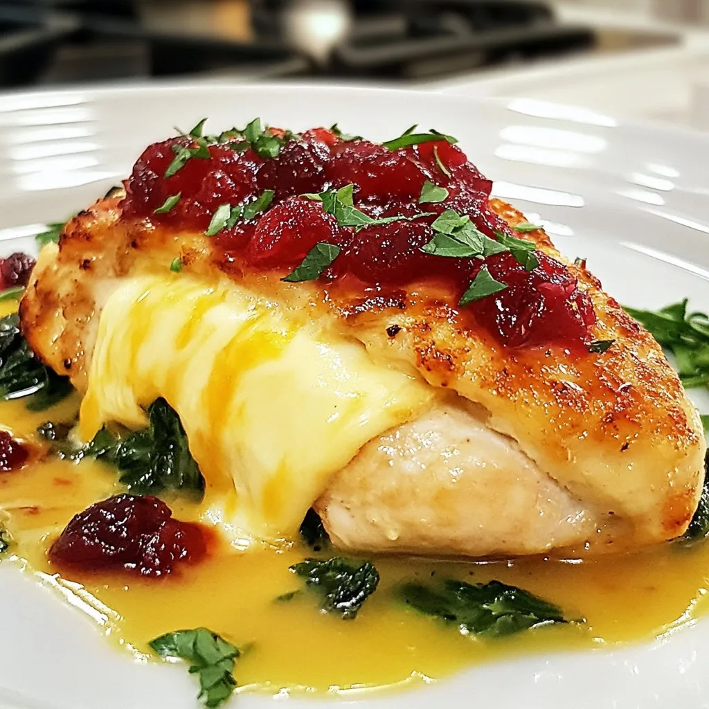 A delicious chicken dish stuffed with brie cheese and cranberry sauce, perfect for a delightful meal.