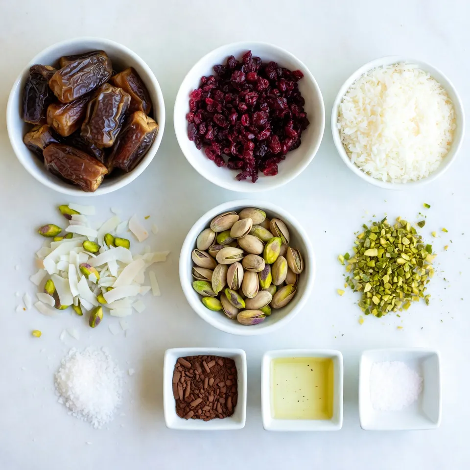 For the additional ingredients, cocoa powder deepens the flavor. Vanilla extract adds a warm note, while a pinch of sea salt enhances all the flavors. The extra chopped pistachios and coconut flakes are for rolling the truffles, making them look pretty.