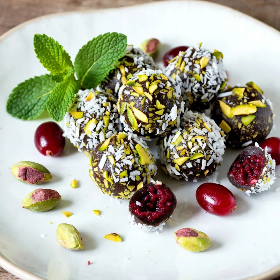Delightful and festive truffles made with dates, cranberries, and pistachios, rolled in coconut and nuts.