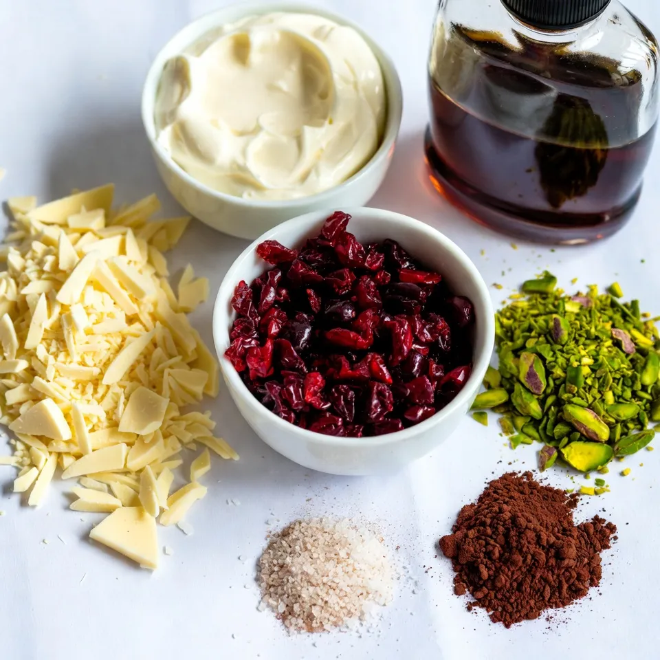 To make Cranberry Pistachio White Chocolate Truffles, you need simple and tasty ingredients. Here’s what you will need: