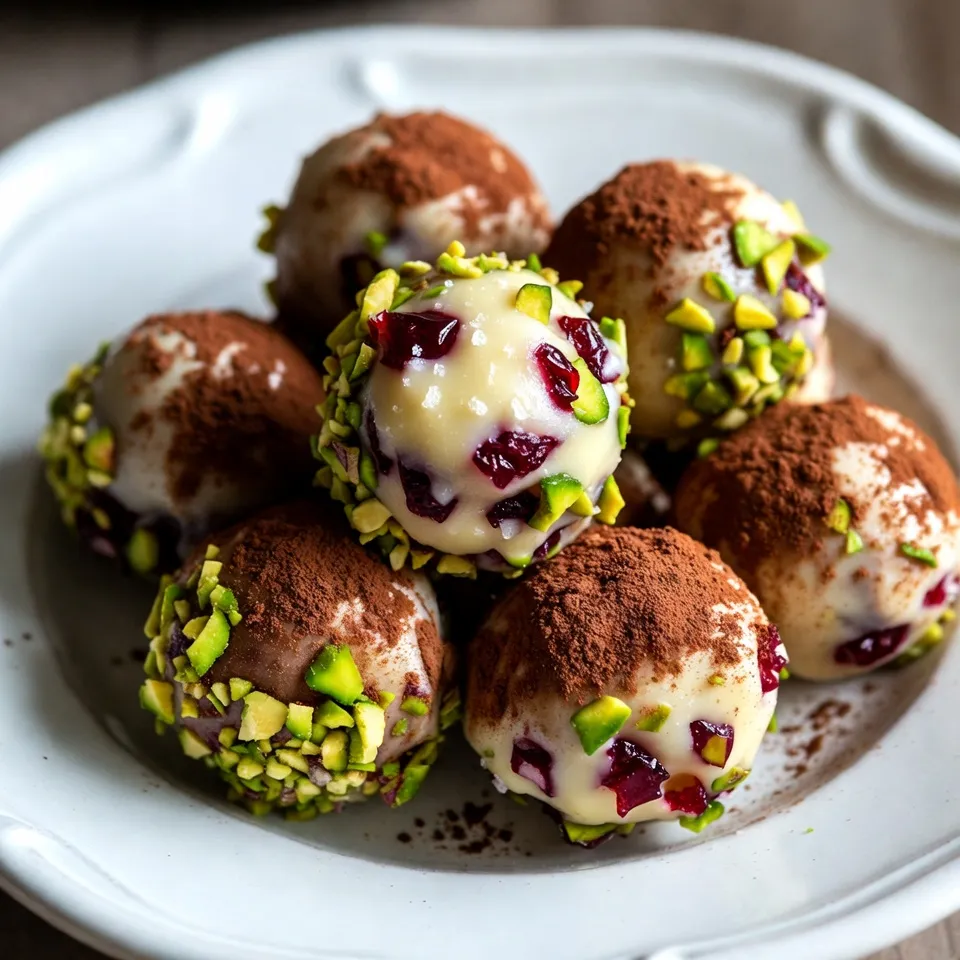 Delicious truffles made with white chocolate, cranberries, and pistachios, perfect for the holiday season.