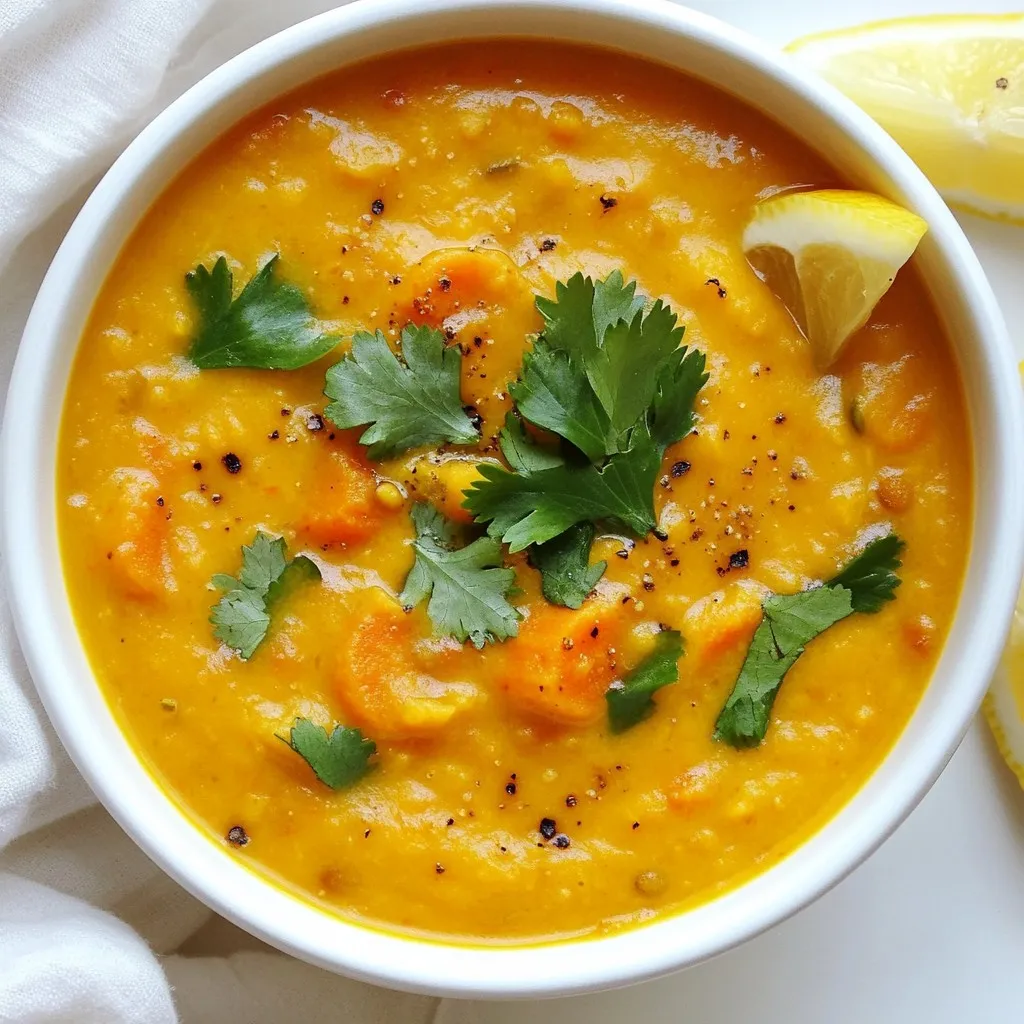 A rich and creamy soup made with red lentils, carrots, and coconut milk, perfect for a comforting meal.