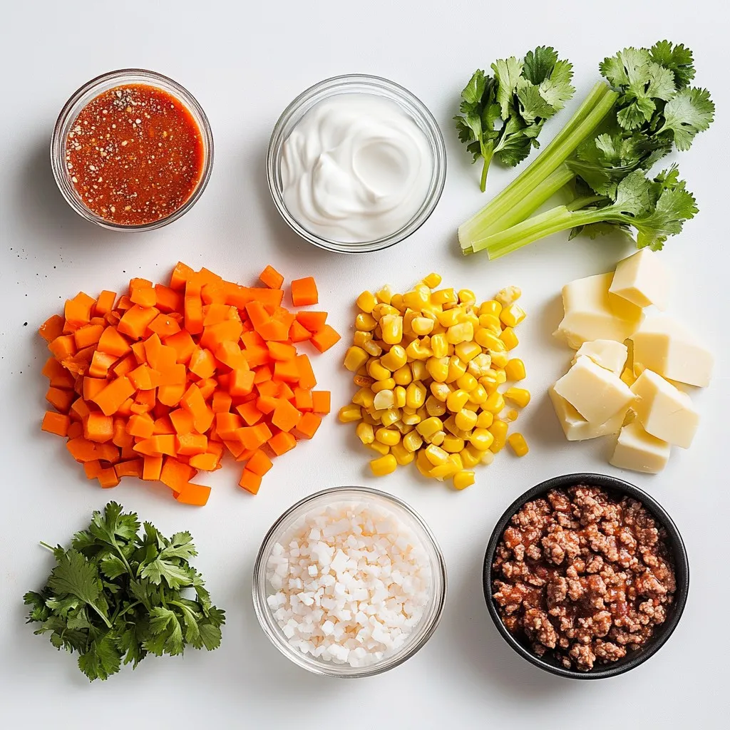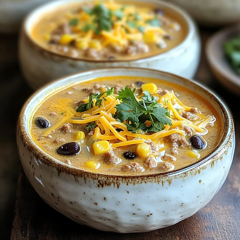 A hearty and creamy soup filled with ground beef, vegetables, and beans, perfect for a comforting meal.