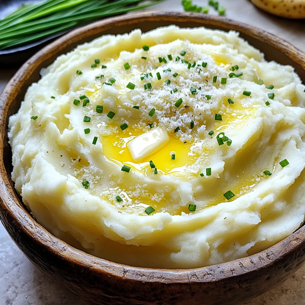 - 2 pounds Yukon Gold potatoes, peeled and chopped into uniform pieces - 4 cloves fresh garlic, finely minced - 1 cup heavy cream, warmed - 1/2 cup unsalted butter, cut into small cubes - 1 cup freshly grated Parmesan cheese - Salt and freshly ground black pepper, to taste - Fresh chives or parsley, finely chopped, for garnish To make creamy garlic Parmesan mashed potatoes, you need the best ingredients. Yukon Gold potatoes are my top choice. They are buttery and smooth. Fresh garlic adds a strong flavor that makes the dish pop. Next, heavy cream gives the potatoes their rich texture. I prefer unsalted butter for a pure taste. Parmesan cheese brings a nice salty flavor that blends well. Always season with salt and black pepper to enhance the taste. Finally, fresh herbs like chives or parsley add a lovely touch. These ingredients work together to create a dish that is both comforting and gourmet. You will love how they combine to create a creamy and delicious side. Start by peeling and chopping 2 pounds of Yukon Gold potatoes. Cut them into even pieces. Place the potatoes in a large pot. Cover them with cold water and add a pinch of salt. Turn the heat to medium-high. Wait for the water to boil. Once it boils, lower the heat to medium-low. Let the potatoes simmer until they are fork-tender. This takes about 15 to 20 minutes. While the potatoes cook, prepare the garlic cream mixture. Take 4 minced garlic cloves and combine them with 1 cup of warmed heavy cream in a small saucepan. Heat this mix on low heat. Make sure it does not boil. You want to warm it until you can smell the garlic. Once the potatoes are tender, drain them in a colander. Return them to the pot. Add 1/2 cup of cubed unsalted butter to the hot potatoes. Let the butter melt for a minute. Then, pour the garlic cream mixture over the potatoes. Use a potato masher for a rustic texture or a hand mixer for a smooth mash. Mash until creamy and free of lumps. Next, fold in 1 cup of freshly grated Parmesan cheese. Mix until the cheese melts into the potatoes. Season with salt and freshly ground black pepper. If you want creamier potatoes, add more heavy cream until you reach the right texture. To make the best creamy garlic Parmesan mashed potatoes, you need to focus on texture. Start by adjusting the cream. If your potatoes feel too thick, add more warmed heavy cream. This helps you reach that dreamy, creamy texture. Avoid gummy potatoes by mashing them right after cooking. Letting them sit can cause them to get sticky. Use a potato masher for a rustic feel or a hand mixer for smoothness. Each method gives you a different style, so choose what you like best. For extra flavor, consider adding more seasonings. Fresh herbs like chives or parsley can brighten the dish. They add color and taste. You can also try a pinch of garlic powder or nutmeg for a unique twist. Using fresh garlic is key to a rich taste. Mince it finely and mix it with the cream. This way, you infuse the potatoes with a strong garlic flavor. Finish your dish with a sprinkle of Parmesan on top. This makes it look even more delicious! {{image_4}} Want to make your creamy garlic Parmesan mashed potatoes even better? You can add more flavors. Here are some great ideas: - Incorporating sour cream or cream cheese: Adding sour cream gives a nice tang. Cream cheese makes the mash even creamier. Just mix in about half a cup for a richer taste. - Including roasted garlic or caramelized onions: Roasted garlic has a sweet flavor. You can roast a whole bulb in the oven. For caramelized onions, cook them slowly in a pan until they turn golden brown. Both options add depth to your mash. Need to adapt the recipe for special diets? No problem! Here are some easy swaps: - Vegan version using plant-based butter and cream: You can use vegan butter and coconut cream instead of regular butter and cream. This keeps the dish creamy without dairy. - Gluten-free considerations: This recipe is naturally gluten-free! Just make sure your butter and any added ingredients are gluten-free. You can enjoy these mashed potatoes without worry. Feel free to experiment with these ideas. Your creamy garlic Parmesan mashed potatoes will always shine! Store your creamy garlic Parmesan mashed potatoes in an airtight container. This keeps them fresh and tasty. If stored properly, they last in the fridge for up to four days. Always let the potatoes cool to room temperature before sealing the container. This helps prevent condensation, which can make the potatoes watery. To bring back the creaminess, add a splash of heavy cream when reheating. Stir well to mix it in. You can use the microwave or stovetop. - Microwave: Place the mashed potatoes in a microwave-safe bowl. Cover with a damp paper towel and heat in 30-second bursts. Stir in between until warmed through. - Stovetop: Pour the potatoes into a saucepan over low heat. Stir often and add more cream if needed. This method gives you control over the texture and heat. Both methods work well, but stovetop reheating can help keep them smooth. Enjoy your delicious mashed potatoes again! Yes, you can make these potatoes ahead of time. - Cook the potatoes and mash them as usual. - Store them in an airtight container in the fridge. - Reheat them gently before serving. This way, you save time on busy days. Just remember to add a little cream or butter when reheating for the best taste. These mashed potatoes pair well with many dishes. - Roast chicken or turkey brings out their flavor. - Grilled steak or pork chops add a nice contrast. - Serve them with sautéed green beans or a fresh salad for balance. They make any meal feel special and rich. To make your mashed potatoes extra creamy, follow these tips: - Use Yukon Gold potatoes for a smooth texture. - Warm your heavy cream before adding it. - Add butter while the potatoes are hot, so it melts well. - For a richer taste, fold in extra Parmesan cheese. If they are too thick, stir in more cream until smooth. Enjo
