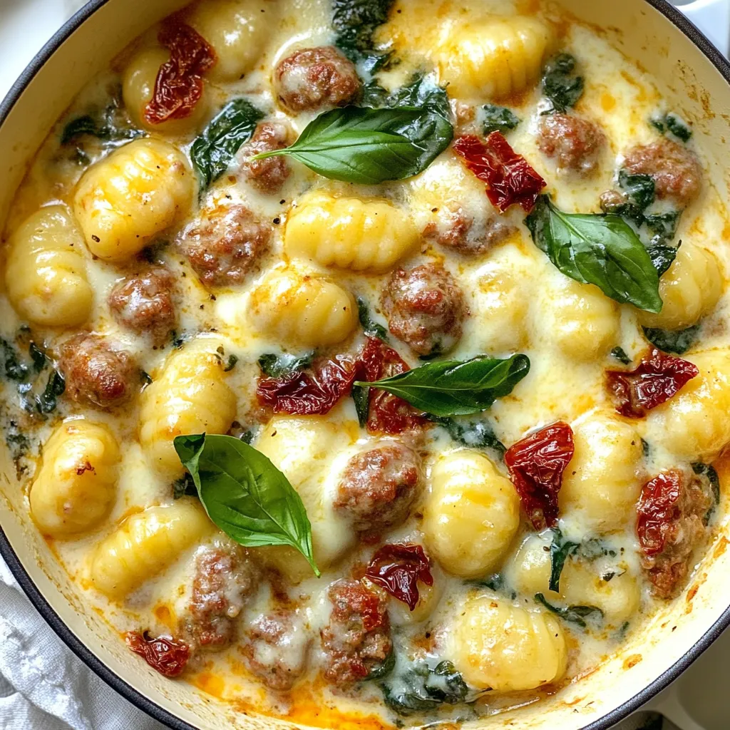 - 1 pound Italian sausage (mild or spicy) - 1 pound gnocchi (store-bought or homemade) - 1 cup heavy cream - 1 cup chicken broth - 1 cup fresh spinach The main ingredients are key to making this creamy sausage gnocchi skillet. The Italian sausage adds a rich flavor. You can choose mild for a gentle taste or spicy for a kick. Gnocchi gives a soft, pillowy texture. Use store-bought for ease or homemade for a fun challenge. Heavy cream makes the dish rich and smooth. Chicken broth adds depth, while fresh spinach brings color and nutrition. - 1/2 cup sun-dried tomatoes, finely chopped - 2 cloves garlic, finely minced - 1 teaspoon Italian seasoning - Salt and pepper to taste Flavor enhancers elevate this dish. Sun-dried tomatoes add sweetness and tang. Garlic gives a warm, savory note. Italian seasoning combines herbs for a classic taste. Don’t forget to adjust salt and pepper. This helps balance all the flavors perfectly. - Fresh basil leaves - 1 cup mozzarella cheese, freshly shredded Garnishes make your dish look and taste even better. Fresh basil leaves add a pop of color and a fresh scent. Shredded mozzarella melts beautifully, adding creaminess. They’re not just for looks; they enhance the taste too. {{ingredient_image_2}} Start by heating a large skillet over medium heat. Add one tablespoon of olive oil to the skillet. Once the oil is hot, add one pound of Italian sausage. You can choose either mild or spicy. Use a spatula to break the sausage into small pieces. Cook for about 5 to 7 minutes. You want it to be browned and cooked through. Next, add two cloves of finely minced garlic to the skillet. Stir it in for about one minute. This will make your kitchen smell amazing! Then, add half a cup of finely chopped sun-dried tomatoes. Pour in one cup of chicken broth. Sprinkle in one teaspoon of Italian seasoning, along with some salt and pepper. Bring the mixture to a gentle simmer. Let it cook for about 5 minutes to blend the flavors. Now, it’s time to make it creamy! Gradually add one cup of heavy cream while stirring. Allow the mixture to return to a gentle simmer. Carefully fold in one pound of gnocchi. Cook according to the package instructions, usually about 3 to 4 minutes. You’ll know it’s done when the gnocchi float to the surface. Once the gnocchi are cooked, stir in one cup of fresh spinach. Cook until the spinach wilts. Then, fold in one cup of freshly shredded mozzarella cheese. Stir until the cheese melts and the sauce is creamy. Adjust the seasoning with more salt and pepper if needed. Let the skillet sit for a few minutes before serving. This will help the flavors come together even more. To get a smooth, creamy sauce, add the heavy cream slowly. Mix it well with the chicken broth before it simmers. This helps keep the cream from curdling. Stir constantly during this step. If you want it richer, you can add more cream or cheese. Gnocchi cooks quickly. When they float to the top of the skillet, they are done. This usually takes about 3-4 minutes. Don’t forget to stir gently, so they don’t stick together. Overcooking can make them too soft, so watch closely. Taste the dish before serving. Adjust seasoning with salt and pepper to suit your taste. If you like spice, add red pepper flakes for a kick. For a fresh feel, try adding lemon juice or zest. Fresh herbs like basil can also boost the flavor. Pro Tips Quality Sausage: Choose a high-quality Italian sausage for the best flavor. Freshly ground sausage often has more spices and a richer taste. Gnocchi Cooking Time: Keep an eye on the gnocchi as they cook; they are done when they float to the surface. Overcooking can lead to a mushy texture. Spinach Variation: Feel free to substitute fresh spinach with kale or arugula for a different flavor profile and added nutrients. Cheese Melting: For an even creamier dish, use a combination of mozzarella and a sharper cheese like parmesan to enhance the flavor depth. {{image_4}} You can use chicken or turkey sausage in this dish. These options are leaner than pork sausage. They still add great flavor and spice. Just cook them the same way as the Italian sausage. The cooking time might be a little less, so keep an eye on them. For a meat-free take, swap the sausage for vegetable stock. This keeps the dish rich and creamy without any meat. You can also add plant-based sausage for more texture. With these changes, you still get a hearty meal that everyone will enjoy. If you don't have spinach, try using kale or other greens. Kale gives a nice crunch and is packed with nutrients. You can also use Swiss chard or arugula for a different flavor. Just add them when you would add the spinach to keep them fresh and colorful. To store leftovers, let the dish cool first. Then, place it in an airtight container. Make sure to seal it well to keep it fresh. You can store it in the fridge for up to three days. This helps keep the flavors intact. When you're ready to eat, just take it out to reheat. If you want to freeze the creamy sausage gnocchi, you can do that too! Pour the cooled dish into a freezer-safe container. Leave some space at the top for expansion. It can stay in the freezer for up to three months. Just label the container with the date. This way, you’ll remember when you made it. To reheat, I suggest using the stovetop for best results. Pour the gnocchi into a skillet over low heat. Add a splash of chicken broth or cream to keep it moist. Stir often to avoid burning. Heat until it’s warmed through, about 5-7 minutes. You can also use the microwave, but be careful. Heat in short bursts, stirring in between, to keep it creamy. Yes, you can use homemade gnocchi in this dish. Making your own gnocchi adds a personal touch. Here are some benefits and tips: - Taste: Homemade gnocchi can taste fresher and more flavorful. - Texture: You can get the texture just right to your liking. - Ingredients: You control the ingredients, making it healthier if desired. To make homemade gnocchi, 