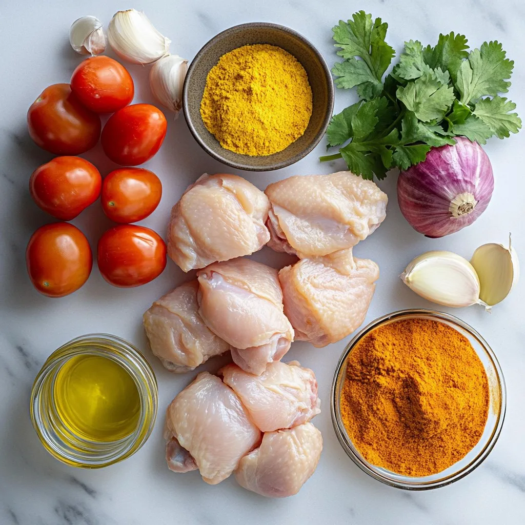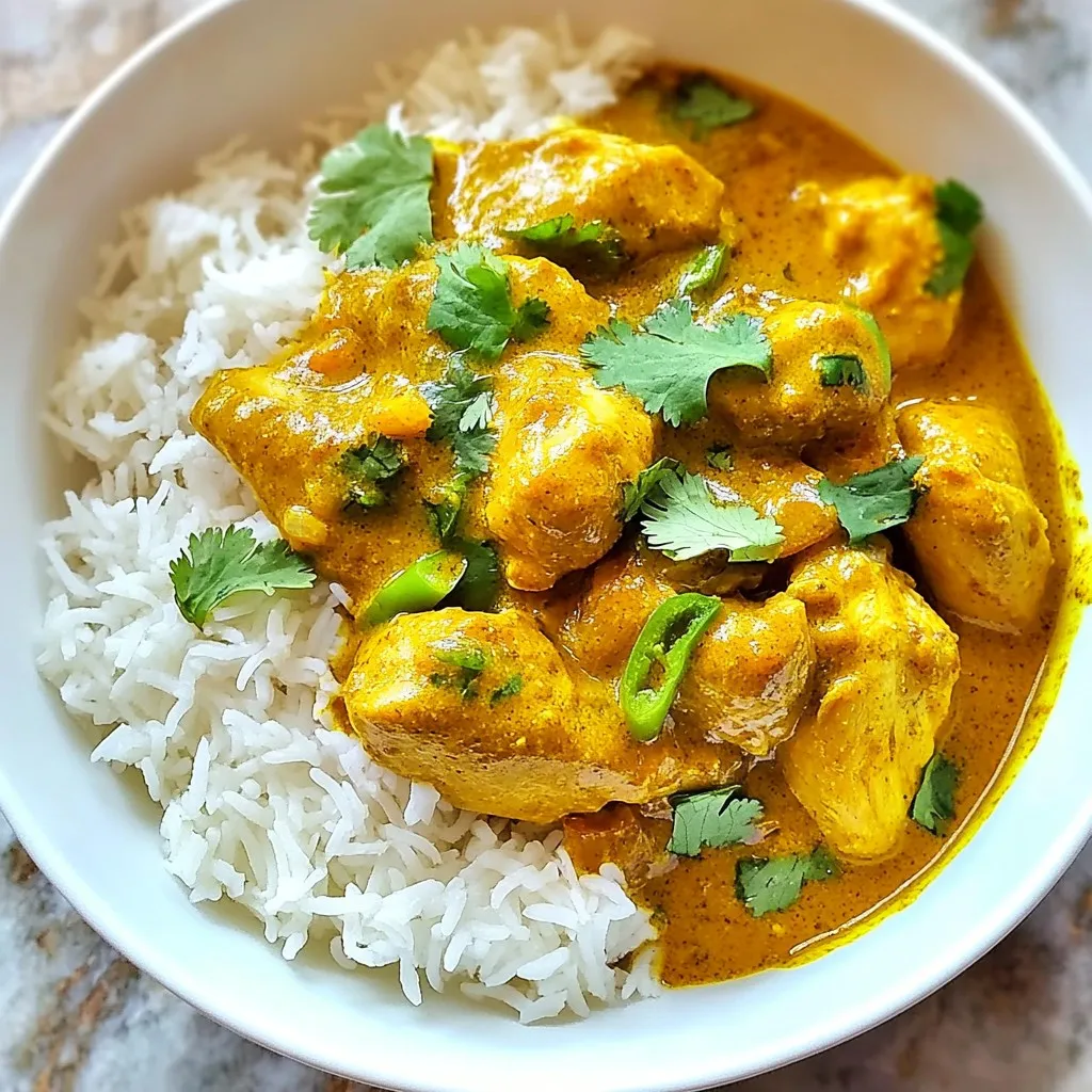 - 500g chicken thighs, boneless and skinless, cut into bite-sized chunks - 1 can (400ml) creamy coconut milk - 1 large onion, finely diced - 4 cloves garlic, minced - 1-inch piece of fresh ginger, grated - 2 ripe tomatoes, blended into a smooth puree - 2 tablespoons robust curry powder - 1 teaspoon ground cumin - 1 teaspoon ground coriander - ½ teaspoon turmeric powder - Sea salt, to taste These ingredients form the heart of your Easy Indian Chicken Curry. The chicken thighs provide a tender and juicy base. Coconut milk adds creaminess and a subtle sweetness. The onion, garlic, and ginger bring deep flavors with each bite. The spices create a warm and aromatic profile that makes this dish so inviting. - 1-2 green chilies, slit lengthwise (adjust based on desired heat) - Fresh cilantro leaves, for garnish - Cooked basmati rice or warm naan, for serving Green chilies can add heat. If you enjoy spice, add one or two. Fresh cilantro gives a fresh touch and brightens the dish. Serving the curry with fluffy basmati rice or warm naan makes it a complete meal. You can tailor these optional ingredients to fit your taste and mood. {{ingredient_image_2}} 1. Start with a large pot. Heat 2 tablespoons of vegetable oil over medium heat. 2. Add 1 large onion, finely diced. Sauté this for 5-7 minutes until it turns golden brown. 3. Add 4 cloves of minced garlic and 1-inch grated ginger. Stir for 1-2 minutes until it smells great. 4. Next, pour in 2 ripe tomatoes, blended into a smooth puree. Add 2 tablespoons of curry powder, 1 teaspoon of ground cumin, 1 teaspoon of ground coriander, and ½ teaspoon of turmeric powder. Cook this mix for 5 minutes. Stir often until it thickens. 1. Now, toss in 500g of chicken thighs, cut into bite-sized pieces. Mix well to coat the chicken with spices. 2. Cook the chicken for 5-7 minutes. Make sure it browns on all sides. 3. Pour in 1 can of creamy coconut milk. Add 1-2 slit green chilies, based on how spicy you want it. Sprinkle in some sea salt to taste. Stir everything together. 4. Bring the pot to a gentle simmer. Cover it and let it cook for 20-25 minutes. Stir every so often to stop it from sticking. 1. After 20-25 minutes, taste your curry. Adjust the seasoning with more salt if needed. 2. If you want a thicker curry, remove the lid. Let it simmer uncovered for 5-10 minutes more. 3. Once done, take the pot off the heat. Garnish with fresh cilantro leaves for a bright touch. 4. Serve the curry in deep bowls with fluffy basmati rice or warm naan for a complete meal. How can you modify heat? Start by using fewer green chilies. You can also use mild chili powder. Mix in some yogurt to cool it down. What are suggested spice blends? Try garam masala for warmth. You can also use curry powder with lower heat. Experiment with paprika for a smoky touch. How do you make a thicker curry? Cook it longer without the lid. This allows excess liquid to evaporate. Adding a pinch of cornstarch can also help. What cooking times should you consider? Simmering for 20-25 minutes ensures tender chicken. If you want a thicker sauce, let it simmer for 5-10 minutes more. Always stir to prevent sticking. Pro Tips Marinate the Chicken: For even more flavor, marinate the chicken chunks in yogurt and spices for a few hours or overnight before cooking. Customize the Heat: Adjust the number of green chilies according to your heat preference. For a milder curry, remove the seeds from the chilies. Fresh Herbs Matter: Using fresh cilantro not only enhances the flavor but also adds a beautiful pop of color to the dish when garnishing. Perfect Coconut Milk: Shake the can of coconut milk before opening to ensure it mixes well. This will create a creamier consistency in your curry. {{image_4}} You can swap chicken with other meats. Try lamb, beef, or shrimp for new tastes. Each meat brings its own flavor. Adjust cooking times based on the meat type you choose. For a vegetarian option, use chickpeas or paneer. These ingredients soak up the spices well. You can also use tofu for a vegan dish. It adds protein and texture. Don’t forget to cook it until it’s golden brown for the best flavor. Adding veggies boosts nutrition and taste. Spinach is a great choice. It wilts nicely into the curry. Bell peppers also add color and crunch. Just chop them up and toss them in during cooking. You can use different curry powders for unique flavors. Garam masala brings warm notes. Madras curry powder adds heat and depth. Feel free to mix and match spices to find your favorite blend. Experimenting is part of the fun! How do you store leftover curry? Place any leftover curry in a sealed container. Make sure it cools down to room temperature first. This helps keep it fresh. Store it in the fridge for up to three days. How long can you keep it? For the best taste, eat it within two days. After three days, the flavor may change. What are the best methods to reheat? The microwave is quick and easy. Pour the curry into a bowl, cover it, and heat it for one to two minutes. Stir halfway through to ensure even heating. You can also reheat it on the stovetop. Pour the curry into a pot over low heat. Stir it frequently until it warms up. Can you freeze it for later use? Yes, you can! Place the cooled curry in a freezer-safe container. It will stay good for three months. When ready to eat, thaw it in the fridge overnight before reheating. You can pair this curry with several tasty side dishes: - Cooked basmati rice - Warm naan bread - Quinoa for a healthier option - Steamed vegetables like broccoli or green beans - A fresh salad with cucumber and tomatoes These sides balance the rich flavors of the curry. Rice soaks up the sauce well, while naan is perfect for scooping. Yes, you can make Easy Indian Chicken Curry ahead of time. It tastes even better the next day! - Cook the curry and let it cool. - Store it in an airtight container in the fridge. - It stays fresh for up to three days. Reheat it on the stove or in the microwave.