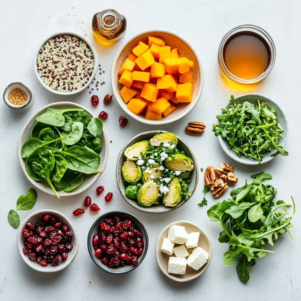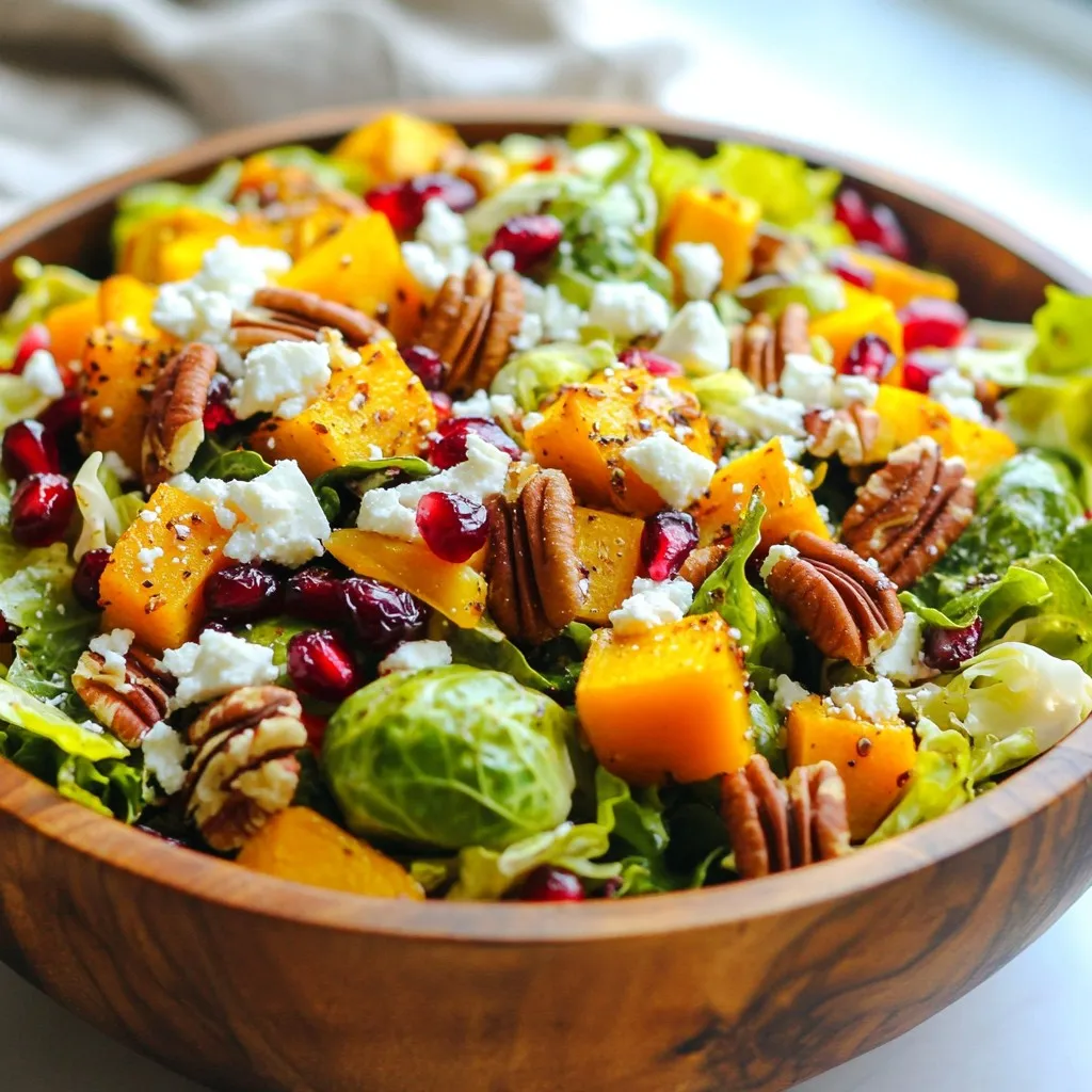 This salad shines with fresh ingredients. The mix of greens adds color and crunch. Spinach, arugula, and kale each bring unique flavors. Butternut squash adds sweetness. When you roast it, it becomes tender and caramelized. Brussels sprouts offer a nice bite. Lastly, pomegranate seeds burst with juice. Their bright color makes the salad pop.