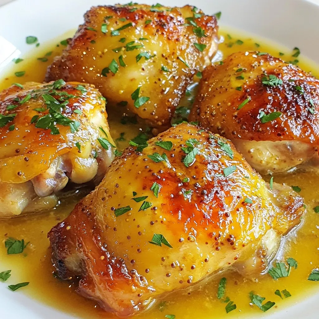 Now, use a brush or your hands to coat each chicken thigh with the mustard mixture. Make sure to cover every part well. Next, pour half a cup of chicken broth into the bottom of the dish. This keeps the chicken moist. Place the dish in the oven and bake for 35 to 40 minutes. Check that the chicken skin turns golden brown. Use a meat thermometer to ensure it hits 165°F (75°C). After cooking, let the chicken rest for five minutes. This helps keep it juicy. Finish with chopped parsley for a fresh touch before serving.
