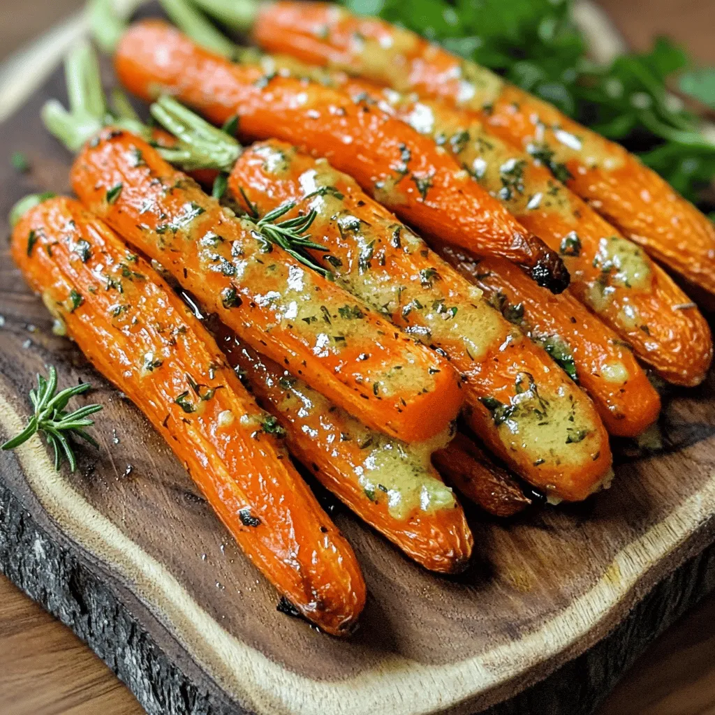 - 1 pound baby carrots, washed and trimmed - 4 tablespoons unsalted butter, melted until lightly browned - 4 cloves of garlic, finely minced - 1 teaspoon fresh thyme leaves (or ½ teaspoon dried thyme) - 1 tablespoon honey - Salt and freshly ground black pepper to taste - Fresh parsley for garnish These ingredients create a truly delightful side dish. The baby carrots shine when roasted, bringing out their natural sweetness. The garlic butter adds rich flavor, making the dish hard to resist. I like to use unsalted butter because it gives you control over the salt. The garlic, when finely minced, releases its bold flavor, mixing perfectly with the butter. Fresh thyme adds an earthy note that balances the sweetness of the carrots. Honey gives a touch of sweetness that enhances the dish. Make sure to season with salt and pepper to taste. A sprinkle of fresh parsley at the end brightens up the plate. For the full details on how to prepare this dish, refer to the Full Recipe. Enjoy the process and the fantastic aroma that fills your kitchen! To start, preheat your oven to 400°F (200°C). This temperature works best for roasting. While the oven heats, grab a large mixing bowl. In this bowl, whisk together the melted butter, minced garlic, thyme, honey, salt, and pepper. You want to mix it well. This garlic butter mixture adds rich flavor to the carrots. Next, add the washed and trimmed baby carrots into the bowl. Toss them gently in the garlic butter mixture. Make sure each carrot gets a good coat. This step is key for flavor. After coating, spread the carrots out on a baking sheet lined with parchment paper. This helps with easy cleanup and prevents sticking. Now, place the baking sheet in the preheated oven. Roast the carrots for 25 to 30 minutes. Halfway through, stir the carrots gently. This ensures even cooking and helps them caramelize beautifully. When they finish roasting, they should be tender and have a lovely golden color. They are now ready to serve. For the full recipe, check out the complete details. To get the best caramelization, start with fresh, young carrots. Their natural sugars will caramelize nicely. Cut them into even sizes. This helps them cook at the same rate. Spacing on the baking sheet is key. If carrots are too close, they will steam instead of roast. Leave space between each carrot. This allows hot air to circulate and create that beautiful golden-brown color. You can customize the garlic butter to your taste. If you love garlic, add an extra clove. For a milder flavor, reduce the amount. Want to enhance sweetness? Honey works great, but you can also use maple syrup. Both options add a delightful touch. For plating, arrange the roasted carrots on a large serving dish. Drizzle any leftover garlic butter from the baking sheet over them. This adds both flavor and visual appeal. These carrots pair well with many dishes. Serve them alongside roasted chicken or grilled fish. They also complement grains like quinoa or rice. Try them with a fresh green salad for a well-rounded meal. For the full recipe, check out the Garlic Butter Roasted Carrots section above. {{image_4}} You can easily change the taste of garlic butter roasted carrots. Adding spices like paprika or cumin gives them a warm kick. These spices blend well with the sweet flavor of the carrots. If you want a fresh touch, try using herbs like rosemary or oregano. Fresh herbs brighten the dish and add depth. Don’t feel tied to just carrots! You can swap them for other root veggies. Try using parsnips or sweet potatoes for a new twist. Mixing carrots with potatoes creates a colorful and tasty blend. Each vegetable brings its own flavor, making the dish even more exciting. Want to make this recipe vegan? Just switch the butter with a plant-based option. Coconut oil or vegan butter works well and keeps the flavor intact. For those with gluten issues, this recipe is naturally gluten-free. You can enjoy these garlic butter roasted carrots without worry! For the full recipe, check out the Garlic Butter Roasted Carrots section above. Once you've enjoyed your garlic butter roasted carrots, let them cool. This keeps them fresh. Place the carrots in an airtight container. Glass or plastic containers work great. You can keep them in the fridge for about three to five days. If you want, you can also wrap them tightly in plastic wrap. Reheating roasted carrots can be quick and easy. The best way is to use the oven. Preheat your oven to 350°F (175°C). Spread the carrots on a baking sheet. Heat them for about 10 to 15 minutes. This will help keep them tender and tasty. You can also use a microwave. Just place the carrots in a microwave-safe dish. Heat them for 1 to 2 minutes, stirring halfway through. If you want to save some for later, freezing works well. First, let the carrots cool completely. Spread them in a single layer on a baking sheet. Freeze them for about an hour. This helps each piece stay separate. Once frozen, transfer the carrots to a freezer bag. Remove as much air as possible before sealing. They can last for up to three months in the freezer. When you’re ready to enjoy them, thaw them in the fridge overnight. Reheat them as described above for the best taste. Garlic butter roasted carrots last about 3 to 5 days in the fridge. Keep them in an airtight container to stay fresh. This way, you can enjoy their rich flavor for a few days after cooking. Yes, you can make these carrots ahead of time. Roast them, then cool and store them in the fridge. To reheat, place them in a 350°F (175°C) oven for about 10-15 minutes. This method helps keep the carrots tender and tasty. Garlic butter roasted carrots pair well with many dishes. Here are some great options: - Grilled chicken or steak for protein - Quinoa or rice for a hearty grain - A fresh salad for added crunch These sides complement the sweet and savory flavors of the carrots. For a full recipe, check the details above. Roasting baby carrots with garlic 