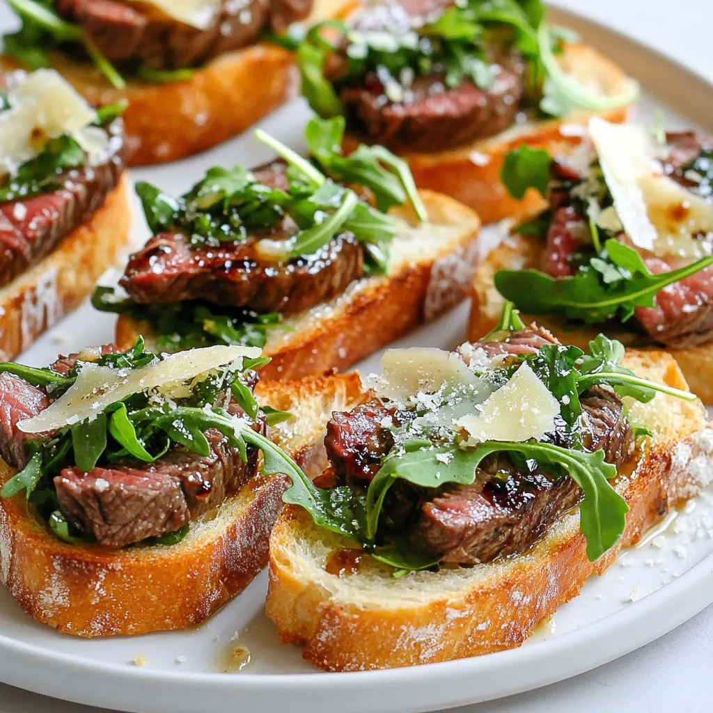 - 1 fresh baguette, sliced into 1/2 inch thick pieces - 1 lb flank steak - 3 cloves garlic, finely minced - 2 tablespoons extra virgin olive oil (plus more for brushing) - 1 tablespoon unsalted butter - Sea salt and freshly ground black pepper, to taste - 1 cup arugula or baby spinach leaves - 1/2 cup finely grated Parmesan cheese - 1 tablespoon balsamic glaze (optional for drizzling) When you make Garlic Steak Crostini, you need fresh, high-quality ingredients. The baguette gives a great base. Flank steak brings rich flavor and texture. Garlic adds a nice kick, while olive oil keeps everything moist. Butter makes the garlic flavor pop, and salt and pepper enhance all the tastes. For the greens, you can use arugula or baby spinach. I like arugula for its peppery bite. Lastly, Parmesan cheese adds a nutty finish. If you want, drizzle balsamic glaze on top for extra sweetness. This mix of flavors makes each bite a delight. {{ingredient_image_2}} First, season the flank steak. Use sea salt, black pepper, and half of the minced garlic. Rub it in well for good flavor. After seasoning, let the steak rest for about 15 minutes. This step helps the meat absorb the seasoning. Next, heat the olive oil in a large skillet. Set the heat to medium-high. Once the oil shimmers, add the flank steak. Sear each side for 4-5 minutes. You want it medium-rare, but cook it longer if you prefer. After cooking, take the steak off the heat. Let it rest on a cutting board for 5 minutes. This resting time allows the juices to spread throughout the meat. Slice the steak thinly against the grain for the best texture. While the steak is resting, preheat your oven to 400°F (200°C). Slice the baguette into 1/2 inch thick pieces. On a baking sheet, arrange the slices in a single layer. Brush both sides of each slice with olive oil. Toast the baguette slices in the oven for 5-7 minutes. Look for a golden brown color and a crispy texture. In a small saucepan, melt the unsalted butter over medium heat. Once the butter has melted, add the rest of the minced garlic. Sauté the garlic for about 1 minute. Be careful not to let it brown, as this will make it taste bitter. Start with a toasted baguette slice. Brush it generously with the garlic butter. Next, layer a few slices of the rested steak on top. Add a small handful of arugula or baby spinach for a fresh pop. Sprinkle a good amount of finely grated Parmesan cheese over each crostini. If you want, drizzle some balsamic glaze on top for extra flavor. Arrange the crostini nicely on a platter. They are best served warm to enjoy all the flavors. - How to achieve the perfect steak doneness: Start by seasoning your flank steak. Use sea salt, black pepper, and half of the minced garlic. Let it rest for 15 minutes. This step helps the flavor soak in. Heat olive oil in a skillet over medium-high heat. Sear the steak for 4-5 minutes on each side for medium-rare. If you prefer it more cooked, add a minute or two. Let the steak rest for 5 minutes before slicing. Cut against the grain for tender slices. - Best methods for toasting baguette: Preheat your oven to 400°F (200°C). Lay the baguette slices on a baking sheet. Brush both sides with olive oil. Toast for 5-7 minutes until golden brown. Keep an eye on them to avoid burning. - Suggestions for garlic butter variations: To change up your garlic butter, try adding some herbs. Fresh parsley or thyme can bring a new taste. You might also add a squeeze of lemon juice for brightness. - Adding herbs or spices to steak: You can mix herbs like rosemary or oregano into the seasoning for the steak. A pinch of smoked paprika can add a nice depth. Experiment with flavors that excite you! - Serving style ideas: Serve your crostini on a rustic wooden board. It creates a warm and inviting look. Arrange the crostini in a way that shows off the layers. - Garnishing options for visual appeal: Add a sprig of fresh arugula on top for color. A light sprinkle of extra Parmesan cheese can also catch the eye. If you drizzle balsamic glaze, it adds a shiny finish. Pro Tips Resting the Steak: Allow the cooked steak to rest for at least 5 minutes before slicing. This helps keep the juices locked in, resulting in a more flavorful and tender bite. Choosing the Right Bread: Opt for a fresh baguette or a crusty artisan bread for the crostini. The texture will enhance the overall experience and provide a satisfying crunch. Garlic Butter Timing: Make the garlic butter right before assembling the crostini to preserve its fresh flavor. Sauté the garlic just until fragrant to avoid bitterness. Layering Flavors: Feel free to add additional toppings like roasted red peppers or a touch of horseradish for extra flavor. Experimenting can lead to delightful variations! {{image_4}} You can switch up the meat in your crostini. Try using chicken or turkey instead of steak. Both options will still give you a tasty bite. Simply season them the same way as the steak. Cook until they reach the right temperature, then slice thinly. If you want a vegetarian option, use roasted vegetables. Bell peppers, zucchini, and eggplant work great. Roast them with olive oil, salt, and pepper. Then layer them on the toasted baguette for a colorful dish. Changing the cheese can really boost the flavor. Instead of Parmesan, try goat cheese or feta. These cheeses add a creamy texture and tanginess. You can also mix cheeses for a rich taste. Experiment with different sauces too. A spicy aioli or a zesty chimichurri can add fun flavors. Drizzle these over your crostini for a unique twist. For fall, consider toppings like caramelized onions or roasted butternut squash. These ingredients add warmth and sweetness. A sprinkle of sage or thyme will enhance the fall vibe. In summer, use fresh vegetables like tomatoes or corn. You can even add a slice of avocado for creaminess. These fresh toppings brighten up the dish and keep it light. To store leftover crostini ingredients, follow these steps: - Steak