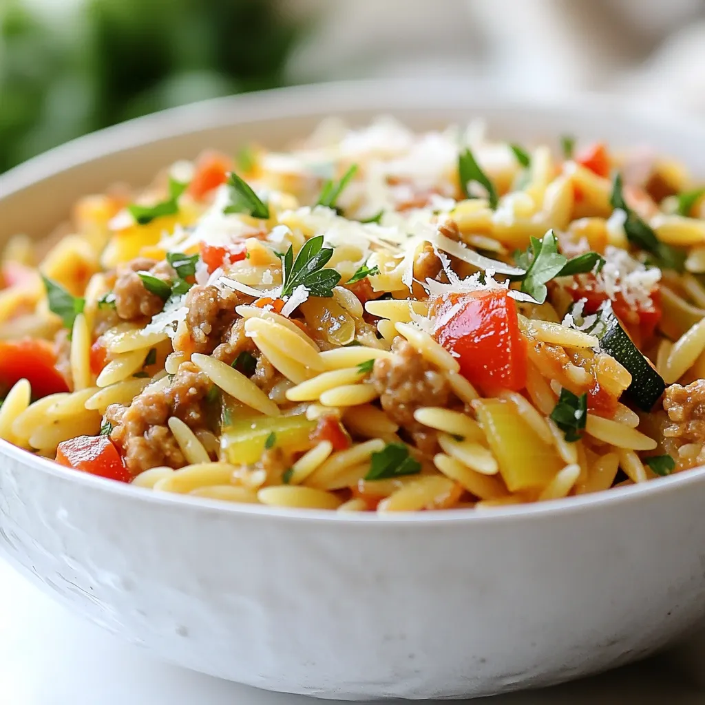 A delicious and hearty dish featuring ground turkey, orzo pasta, and a medley of vegetables, perfect for a comforting meal.