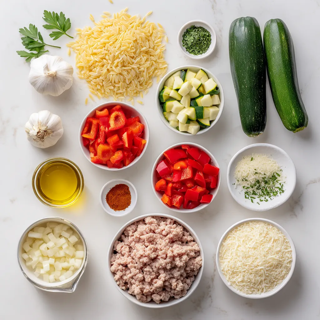 Gather these ingredients before you start cooking. Ground turkey gives a nice lean protein base. Orzo pasta adds a fun texture. Low-sodium chicken broth keeps the dish flavorful without too much salt.