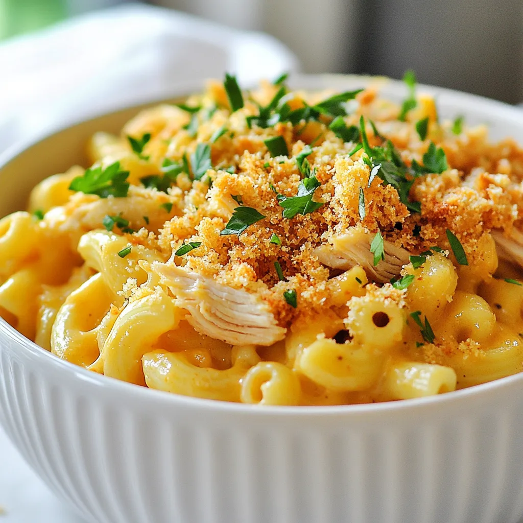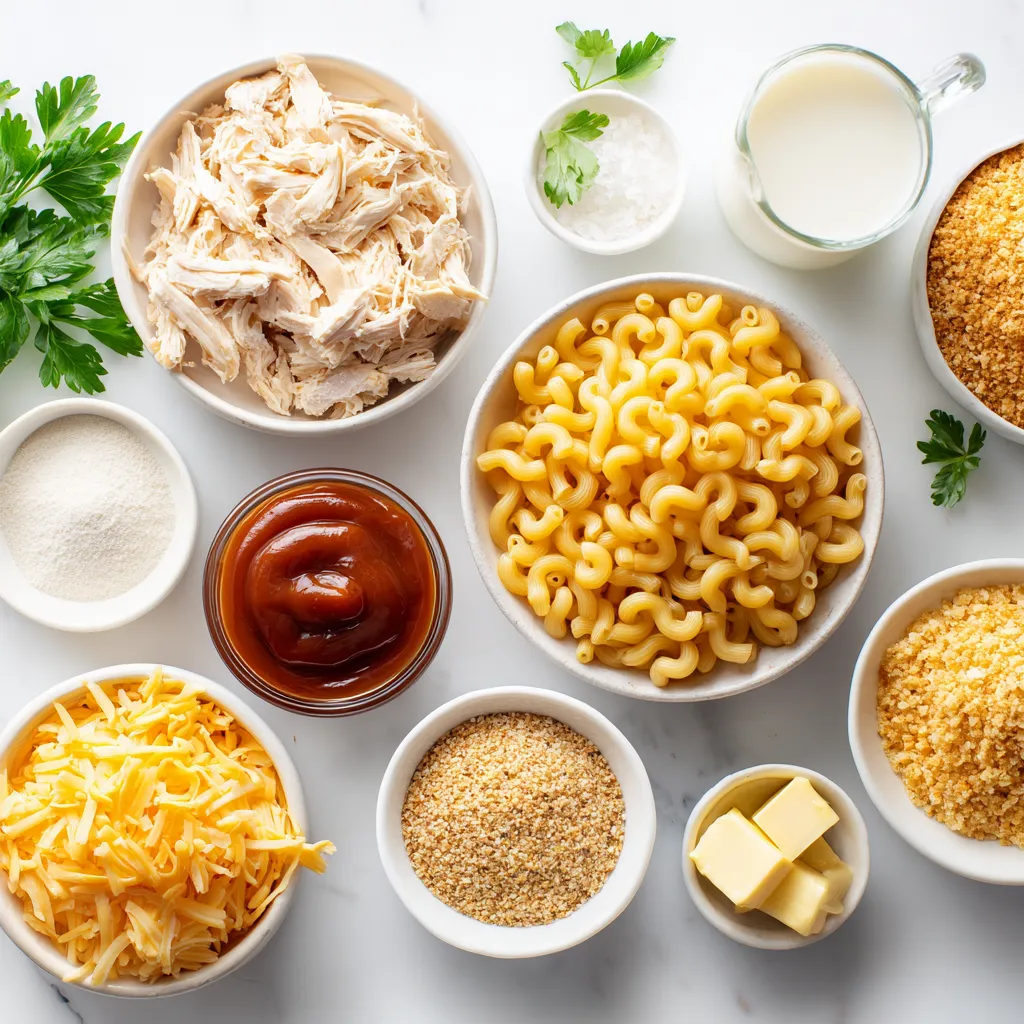 A creamy and cheesy mac and cheese dish with shredded chicken and a sweet honey BBQ sauce, topped with crunchy breadcrumbs.