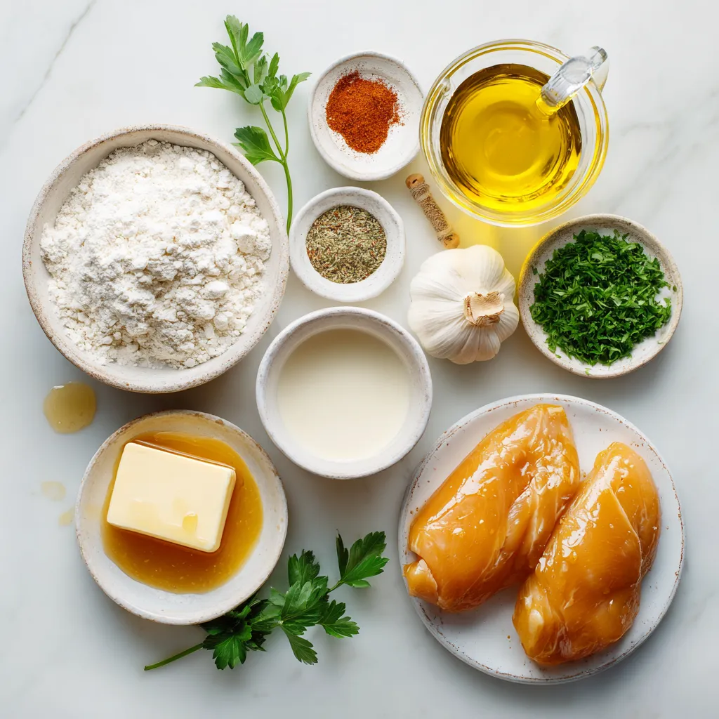 For the dry coating, all-purpose flour forms the base. Garlic powder and paprika boost flavor. Salt and black pepper add the perfect touch.