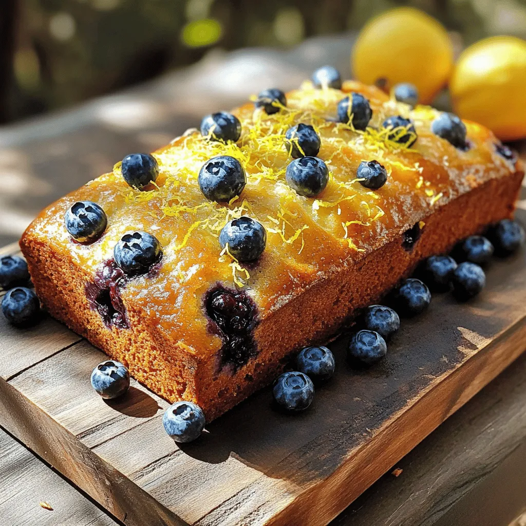 - Fresh blueberries - All-purpose flour - Baking powder and baking soda - Unsalted butter and granulated sugar - Eggs, vanilla extract, and lemon components - Buttermilk (or substitute) When making Lemon Blueberry Bread, fresh blueberries are key. They add sweetness and a burst of flavor. You can use frozen blueberries, but make sure to thaw and drain them first. All-purpose flour is the base of this bread, giving it structure. Baking powder and baking soda are the leavening agents that help the bread rise. Unsalted butter provides richness, while granulated sugar adds sweetness. Eggs hold everything together. They also help with the bread's texture. Pure vanilla extract enhances the flavor. Zest and juice from a lemon give the bread its signature tang. Buttermilk, or a milk and vinegar mix, keeps the bread moist and tender. You can adjust some ingredients based on your needs. For a gluten-free option, use a gluten-free flour blend. If you want to lower sugar, try using a sugar substitute. You can swap buttermilk with regular milk mixed with vinegar. If you have no lemons, lemon extract is a good alternative. To bake this bread, you need a few tools: - Loaf pan and mixer - Measuring cups and spoons - Parchment paper and mixing bowls A loaf pan is essential for shaping the bread. An electric mixer makes creaming butter and sugar easy. Measuring cups and spoons ensure accurate ingredient amounts. Parchment paper helps with easy bread removal. Mixing bowls are needed for combining all the ingredients. For the full recipe, refer to the section above. 1. First, preheat your oven to 350°F (175°C). This helps the bread bake evenly. 2. Grease a 9x5-inch loaf pan with butter or cooking spray. Line it with parchment paper. 3. Measure out your dry ingredients: 1 ½ cups all-purpose flour, 1 teaspoon baking powder, ½ teaspoon baking soda, and ½ teaspoon salt. Set this dry mix aside for later. 1. In a large bowl, cream together ½ cup unsalted butter and 1 cup granulated sugar. Use an electric mixer for about 3-4 minutes. This makes the mix light and fluffy. 2. Add 2 large eggs, one at a time. Mix well after each egg to blend them in. 3. Next, add 1 teaspoon pure vanilla extract, the zest of 1 lemon, and 2 tablespoons of freshly squeezed lemon juice. Mix until everything is combined well. 1. Now, slowly add your dry ingredients to the wet mix. Alternate with ½ cup buttermilk. Start with a third of the dry mix, then add half the buttermilk. Repeat this until all is mixed together. 2. Be careful not to overmix. You want a tender bread. 3. Gently fold in 1 cup of fresh blueberries with a spatula. Make sure not to smash the berries. 1. Pour the batter into your prepared loaf pan. Smooth the top with a spatula. 2. For decoration, scatter extra blueberries and a sprinkle of lemon zest on top. It looks great! 3. Bake the bread for 55-65 minutes. Check doneness by inserting a toothpick into the center. It should come out clean or with a few moist crumbs. 4. Once it’s done, let it cool in the pan for about 10 minutes. Lift it out using the parchment paper. Transfer it to a wire rack to cool completely. For the full recipe, check the section above. Enjoy your baking! To get the best lemon blueberry bread, avoid overmixing your batter. Overmixing can lead to tough bread. Mix just until everything is combined. This keeps it light and fluffy. Next, ensure your bread has the right texture and moisture. Use room temperature ingredients like eggs and butter. They blend better and help the bread rise evenly. Adding buttermilk also gives a soft crumb, making each slice tender. When it comes to blueberries, fresh is often best. Fresh blueberries burst with juice and flavor. However, frozen blueberries can work too. Just remember to thaw and drain them first. This prevents excess moisture in your batter. For an extra lemon kick, add more zest. Zest brings bright flavor without adding liquid. You can also squeeze in a bit more lemon juice for tang. These simple tweaks make your bread taste even better! The oven temperature is key for perfect baking. Set your oven to 350°F (175°C). This heat allows the bread to rise and bake evenly. If you live at a high altitude, you may need to adjust your recipe. Reduce the baking time and increase the oven temperature slightly. This helps counteract the lower air pressure. Keep an eye on your bread as it bakes. Check for doneness with a toothpick. For the full recipe, check out the full recipe section. {{image_4}} You can change the flavor of your Lemon Blueberry Bread in fun ways. Adding nuts gives a nice crunch. Try using walnuts or pecans for a rich taste. Spices like cinnamon or nutmeg can also enhance the bread's warmth. You may also swap out blueberries for other fruits. Raspberries or strawberries work well too. They add a different sweetness and color. Mix and match to find your favorite combo! If you follow a vegan diet, you can still enjoy this bread. Replace the eggs with flaxseed meal or applesauce. Use a plant-based butter for a creamy texture. For gluten-free options, try a gluten-free flour blend. Make sure it has a binding agent like xanthan gum. You can also create a low-sugar version by using a sugar substitute. This helps keep it sweet but lower in calories. Lemon Blueberry Bread makes a great breakfast or dessert. Serve it warm with a pat of butter. You can also add a dollop of whipped cream or yogurt on top for a treat. Pair the bread with beverages for a complete meal. A cup of tea or coffee complements the flavors nicely. For a refreshing twist, try it with lemonade or iced tea. Enjoy this versatile bread any time of day! After you bake your Lemon Blueberry Bread, you'll want to keep it fresh. You can store it at room temperature for a few days. Just wrap it in plastic wrap or foil. This keeps it moist and tasty. If you live in a warm area, the fridge is better. It helps prevent mold but may dry out the bread. To keep the bread fresh, always ensure it