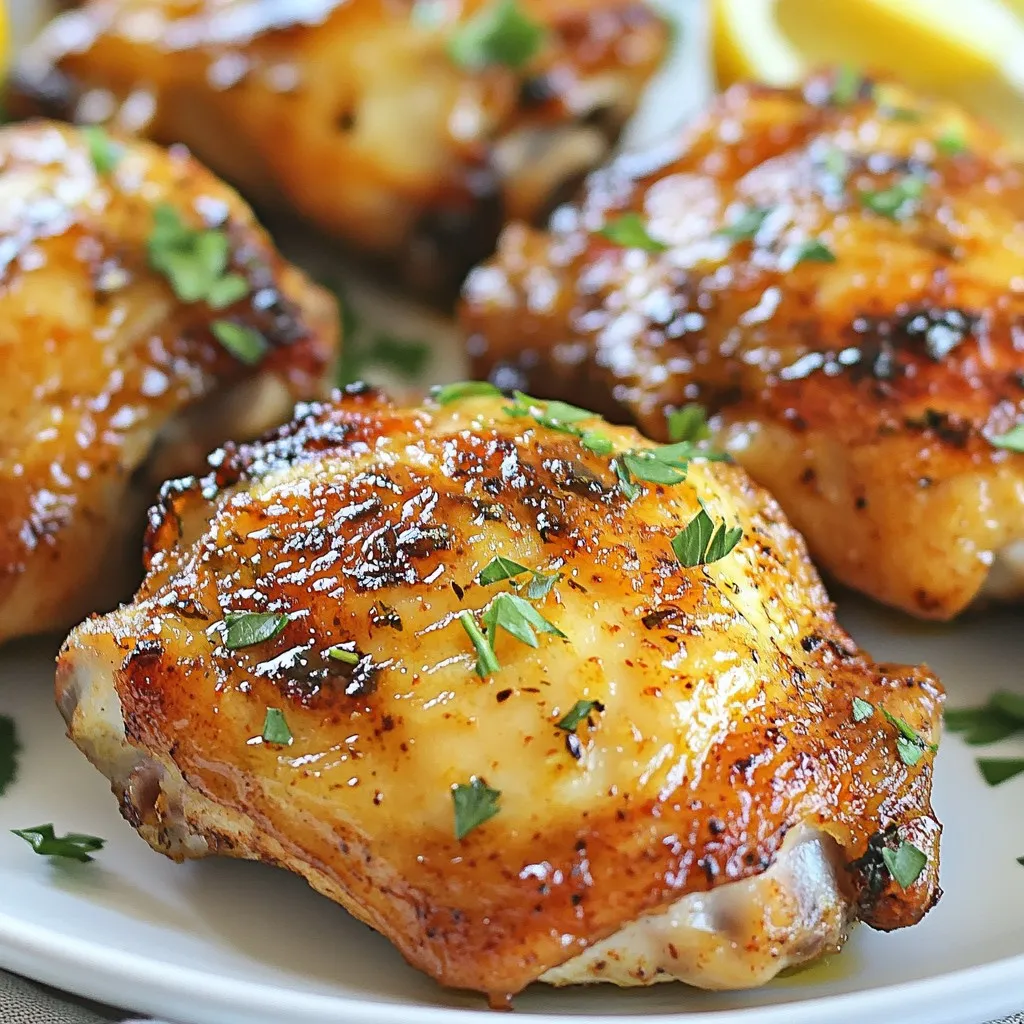 Before serving, sprinkle freshly chopped parsley over the chicken thighs for a vibrant garnish that adds both color and a fresh taste.