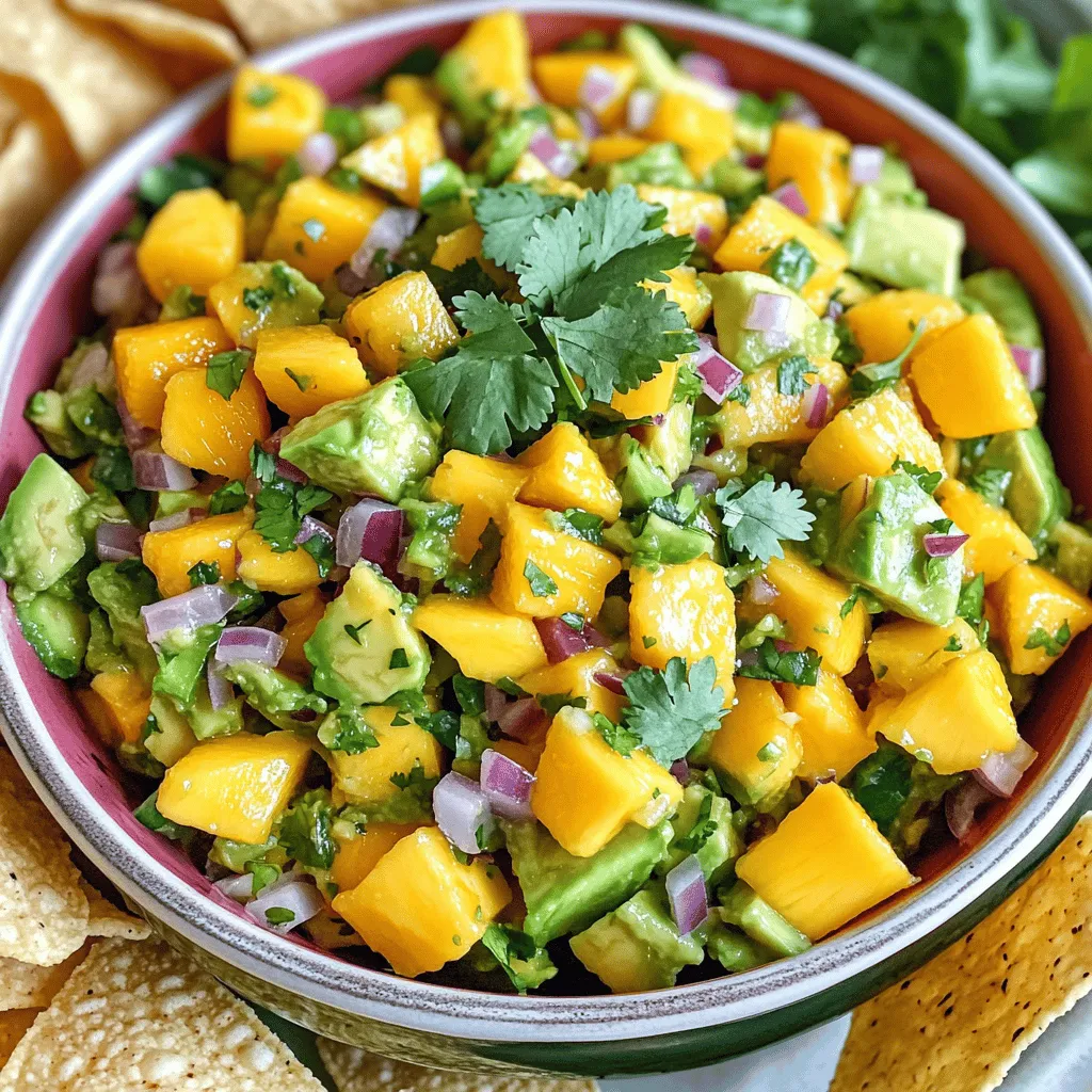 ![- Ripe mangoes - Fresh avocados - Red onion and jalapeño - Cilantro and lime juice - Olive oil and seasoning Selecting the perfect mango Look for mangoes that feel slightly soft when you press them. A ripe mango will have a sweet aroma and a vibrant color. If you find green or hard mangoes, let them ripen at room temperature for a few days. Choosing ripe avocados Avocados should yield gently to pressure. If they feel very soft, they may be overripe. A ripe avocado looks dark and has a slight shine. If you buy them hard, let them sit on your counter for a few days. Fresh herbs and spices Always choose fresh herbs for your salsa. They add bright flavors that dried herbs cannot match. For cilantro, look for bright green leaves without any wilting. Fresh jalapeños should feel firm and have a shiny skin. Using these quality ingredients will make your Mango Avocado Salsa sing with flavor. For the full recipe, check out the detailed instructions above! First, I start by dicing the mango. Choose a ripe mango; it should feel slightly soft. Cut off the sides of the pit, then score the flesh into small cubes. Use a spoon to scoop them out easily. Next, I prepare the avocados. I slice them in half, remove the pit, and scoop out the flesh. I dice the avocado into small pieces, taking care not to mash it. Now, I chop the red onion. I use a small knife to finely chop it. The onion adds a sweet crunch. For the jalapeño, I slice it in half and remove the seeds. I mince it into tiny pieces. This step is key for adding some heat. Adjust the amount based on your spice tolerance. In a medium bowl, I combine the diced mango and avocado. Gently mix these two to keep the avocado's creamy texture. Next, I add the chopped red onion and minced jalapeño to the bowl. I mix carefully to avoid mashing anything. Then, I sprinkle fresh cilantro over the top. This herb brings a bright taste to the salsa. In a small bowl, I whisk together the lime juice and olive oil. I want this mixture well combined before I drizzle it over the salsa. Now, I carefully toss all the ingredients using a large spoon. I make sure everything is mixed well but avoid over-mashing the avocado. To finish, I season the salsa with salt and freshly cracked black pepper. I taste it and adjust the seasoning as needed. Finally, I let the salsa rest for about 10 minutes. This time allows the flavors to meld beautifully. If you want the full recipe, check out the [Full Recipe]. You can easily boost the heat of your mango avocado salsa. Just add extra jalapeño. Start with half a pepper, then taste and adjust. For a sweeter twist, try adding honey or agave syrup. This will balance the flavors and make it more delicious. Serve your salsa in a bright bowl. The colors will catch the eye. Garnish with fresh cilantro leaves on top. This adds a nice touch. Pair it with crispy tortilla chips for dipping. You can also use it as a topping for grilled chicken or fish. It makes any meal feel special. To keep your salsa fresh, store it in an airtight container. Place it in the fridge right after serving. It can stay good for up to two days. If the avocado starts to brown, mix it well before serving again. This will help it look and taste fresh. For the full recipe, check out the recipe link above. {{image_4}} You can add a fun twist to your mango avocado salsa. Try adding diced pineapple or kiwi for a sweet burst. Pineapples add juicy sweetness, while kiwi brings a tangy zing. Both fruits brighten the dish and enhance its tropical vibe. Incorporating black beans also adds a hearty touch. Black beans provide protein and fiber, making your salsa more filling. They pair well with the sweetness of mango and creaminess of avocado. Changing herbs can transform your salsa. Try using fresh basil or mint instead of cilantro. Basil gives a sweet, aromatic flavor. Mint adds a refreshing note, perfect for summer dishes. You can also add diced tomatoes or corn for extra texture. Tomatoes bring juiciness, while corn adds a sweet crunch. Both enhance the overall flavor and make your salsa even more colorful. Making your salsa vegan is easy. The recipe is already free of animal products. You can also make it gluten-free by ensuring your ingredients are certified gluten-free. For a low-sodium version, skip the added salt. The natural flavors from the fruits and lime juice shine through. You can also use a salt substitute if you prefer. Feel free to explore these variations and find what you love most! For the full recipe, check out the delicious details. Mango Avocado Salsa is fresh and fun. This salsa pairs well with many dishes. Here’s what you need: - 1 perfectly ripe mango, diced into small cubes - 2 ripe avocados, peeled, pitted, and diced - 1 small red onion, finely chopped for sweetness - 1 jalapeño pepper, seeded and minced (adjust spice level) - 1/4 cup fresh cilantro leaves, chopped coarsely - Juice of 1 fresh lime for tanginess - 1 tablespoon high-quality extra virgin olive oil - Salt and freshly cracked black pepper to taste Prep Time: 15 minutes Total Time: 25 minutes Servings: 4-6 You’ll start by mixing the mango and avocado gently. Then, add the onion and jalapeño. Next, sprinkle in the cilantro. In a small bowl, whisk lime juice with olive oil. Drizzle this over the salsa and toss it together. Finally, season with salt and pepper to taste. Let the salsa rest for 10 minutes before serving to blend the flavors. Each serving has about 120 calories. This salsa is low in fat but high in flavor. It is rich in vitamins A and C, which help boost your immune system. You’ll also benefit from healthy fats found in avocados, which support heart health. Plus, fresh cilantro adds antioxidants for a healthy kick. Enjoy this tasty dish knowing it’s good for you! You can store Mango Avocado Salsa for about 1 to 2 days in the fridge. To keep it fresh, place it in an airtight container. This helps prevent browning. The lime juice does slow down browning a bit, but it wil