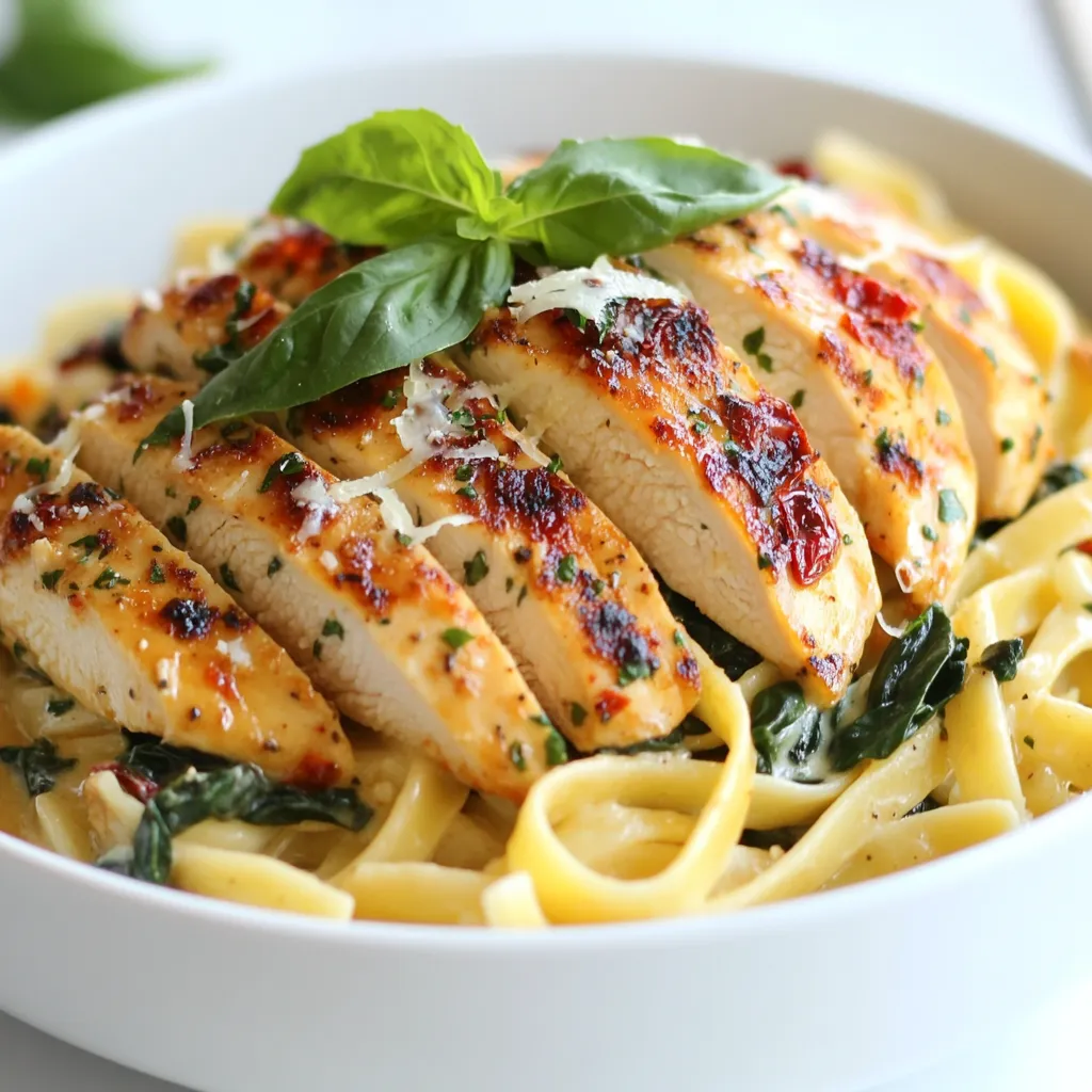 A delicious and creamy pasta dish featuring chicken, sun-dried tomatoes, and spinach, perfect for impressing your loved ones.