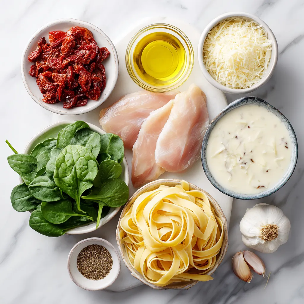 For this dish, I love using chicken breasts. They cook quickly and stay juicy. Fettuccine works well, but feel free to choose any pasta you like. The sauce mixes heavy cream with sun-dried tomatoes and spinach for a rich taste. Parmesan cheese adds a creamy finish.
