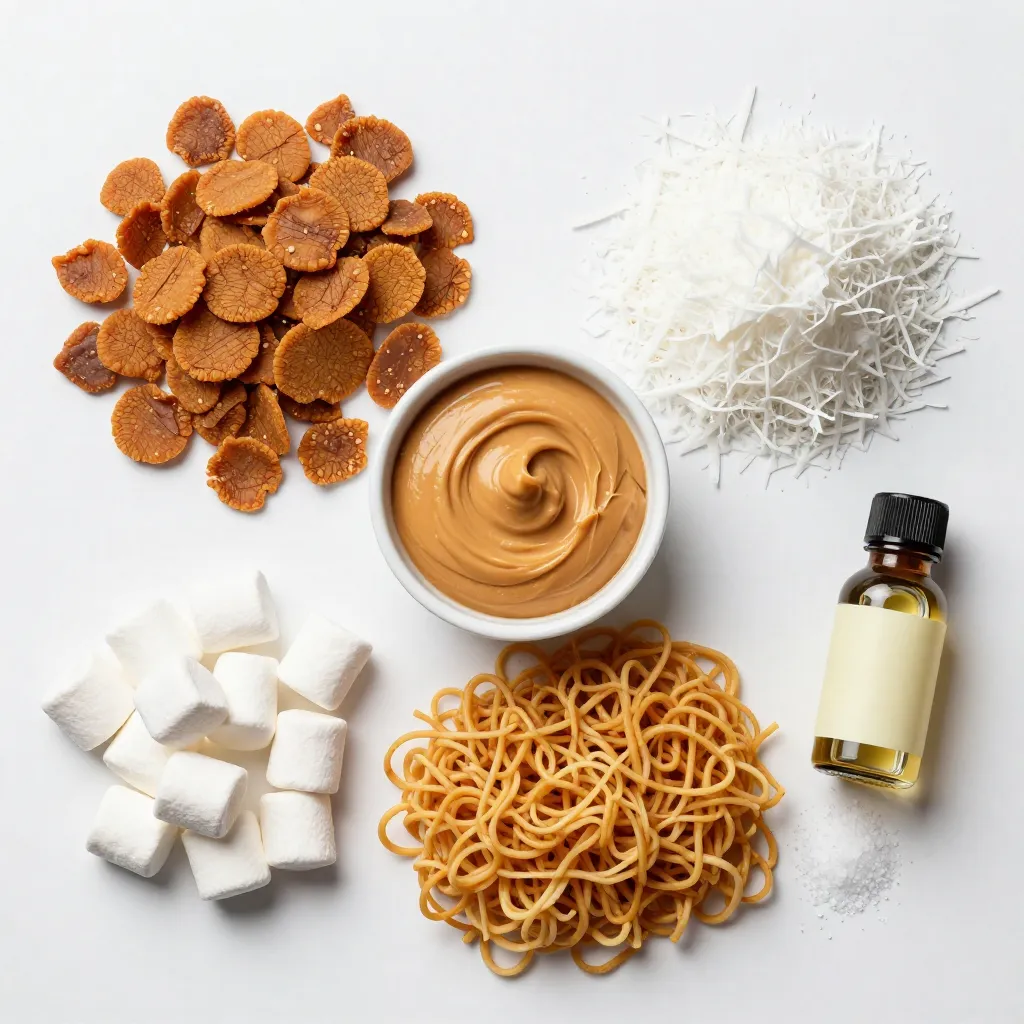 In a large mixing bowl, combine the Chinese chow mein noodles, mini marshmallows, and shredded coconut (if you're using it). Mix them gently to avoid crushing the marshmallows.