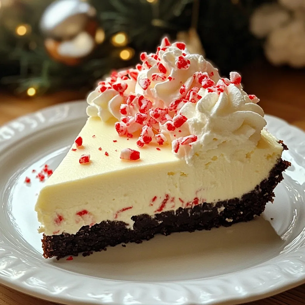 A festive and creamy no-bake cheesecake with a chocolate cookie crust and peppermint flavor.