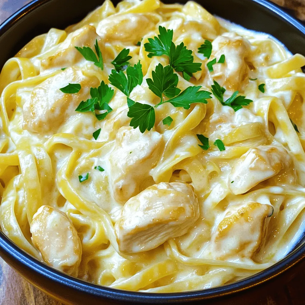 To make your One-Pot Chicken Alfredo creamier, add more heavy cream. You can also increase the Parmesan cheese. Stir these in slowly over low heat. This helps the cheese melt smoothly. Another tip is to let the dish sit for a few minutes after cooking. This allows the sauce to thicken and become richer.