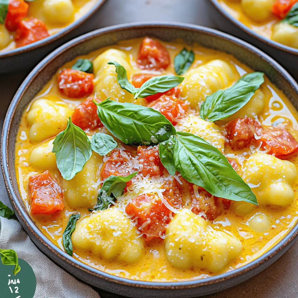 To make One-Pot Creamy Tomato Basil Gnocchi, you will need: - 1 pound gnocchi (store-bought or homemade) - 2 tablespoons extra virgin olive oil - 1 medium onion, finely diced - 4 cloves garlic, minced - 1 can (14 oz) diced tomatoes with juices - 1 cup vegetable broth - 1 cup heavy cream (or coconut cream for a dairy-free alternative) - 1 teaspoon dried Italian herbs (such as basil, oregano, and thyme) - Salt and freshly ground black pepper to taste - 1 cup fresh basil leaves, roughly chopped - ½ cup grated Parmesan cheese (optional for garnishing) You can add a few optional ingredients to boost the taste: - Red pepper flakes for heat - A splash of white wine for depth - Lemon zest for brightness - A sprinkle of fresh mozzarella for creaminess If you need to make swaps, here are some ideas: - Use gluten-free gnocchi for a gluten-free meal. - Swap heavy cream with coconut cream for a dairy-free version. - Replace Parmesan with nutritional yeast for a vegan option. - Use chicken broth instead of vegetable broth for more flavor. These variations help make this dish fit your taste and dietary needs. Start by heating the olive oil in a large pot over medium heat. You want the oil hot but not smoking. Add the finely diced onion first. Sauté it for about 3-4 minutes. Watch for the onion to turn translucent. This shows it’s ready. Next, stir in the minced garlic. Cook for one more minute. You will smell the nice garlic aroma soon. After the aromatics are ready, it’s time to add the main ingredients. Pour in the can of diced tomatoes, including their juices. Next, add the vegetable broth and heavy cream. Stir everything well to mix. This combination will form a rich, creamy base for your dish. Now, raise the heat slightly to bring the mixture to a gentle simmer. This step helps the flavors come together. Add the gnocchi to the pot and cook for about 5-7 minutes. Stir occasionally to keep the gnocchi from sticking. They will puff up and become tender. Next, sprinkle in the dried Italian herbs. Season with salt and freshly ground black pepper. Stir for another 2-3 minutes. This allows the herbs to release their flavors. Finally, remove the pot from heat. Gently fold in the fresh basil and grated Parmesan cheese, if you’re using it. The cheese will melt, making the sauce even creamier. To make your sauce creamy, use heavy cream or coconut cream. Heavy cream adds rich flavor. Coconut cream gives a nice dairy-free option. Heat the cream slowly to prevent curdling. Stir it well when you add it to the pot. This makes the sauce smooth and velvety. Seasoning is key to a great dish. Start with salt and black pepper to taste. Add dried Italian herbs for depth. These herbs can include basil, oregano, and thyme. Fresh basil is a must at the end. It adds a bright flavor that makes this dish special. Taste as you cook. Adjust the seasoning to your liking for a perfect balance. When serving, ladle the gnocchi into bowls. Top with extra fresh basil and Parmesan cheese. This adds color and flavor. Pair this dish with crusty bread for a complete meal. A simple green salad makes a nice side. This dish is perfect for cozy dinners or gatherings. Enjoy the creamy goodness! {{image_4}} If you want a dairy-free version of this dish, use coconut cream. It gives a rich taste and keeps it creamy. You can also skip the Parmesan cheese or use a dairy-free alternative. This way, you keep the flavor while making it safe for those who can’t have dairy. Adding protein makes this meal heartier. You can cook diced chicken or sausage with the onions. Brown the meat until cooked, then follow the recipe as usual. This addition brings more flavor and makes the meal more filling. You can also use plant-based sausage for a vegetarian twist. Want to add more nutrition? Toss in some veggies! Spinach, bell peppers, or zucchini work great. You can add them after sautéing the onion and garlic. Cook them for a few minutes to soften before adding the tomatoes. This way, you boost the dish's color and health benefits without losing its creamy goodness. I recommend storing your One-Pot Creamy Tomato Basil Gnocchi in an airtight container. Let it cool to room temperature first. Then, seal the container and place it in the fridge. This keeps it fresh and tasty for later meals. To reheat, add your gnocchi to a pan over low heat. Stir in a splash of vegetable broth or cream to help restore creaminess. Cook for about 5 minutes, stirring often, until it’s warmed through. You can also use a microwave. Heat in short bursts, stirring in between. In the fridge, this dish lasts for up to 3 days. If you want to keep it longer, freeze it. It will stay good in the freezer for about 3 months. Just make sure to use a freezer-safe container to avoid freezer burn. Yes, you can use fresh gnocchi. Fresh gnocchi cooks fast and tastes great. Just add it to the pot the same way as the store-bought kind. The cooking time might be shorter, so check it often. Fresh gnocchi will give your dish a soft, fluffy texture. To add some heat, try adding red pepper flakes. Start with a pinch and adjust to your taste. You can also add diced fresh chili peppers or a splash of hot sauce. Mix it in while cooking for the best flavor, and enjoy the extra kick! This dish pairs well with crusty bread. A fresh salad works too, adding a nice crunch. You could also serve it with grilled chicken or shrimp for added protein. For a full meal, consider a light dessert, like sorbet, to finish. This post detailed how to make One-Pot Creamy Tomato Basil Gnocchi. We discussed the key ingredients, cooking steps, and tips for texture. You now know possible variations and storage methods. This dish is versatile and easy to prepare. It's a great meal for busy days. Experimenting with flavors and ingredients makes cooking fun. Enjoy creating your own version soon!