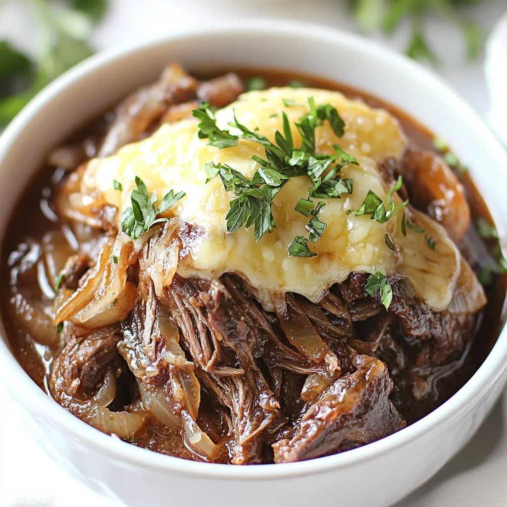 A delicious pot roast infused with the flavors of caramelized onions and melted cheese, cooked slowly for tender perfection.