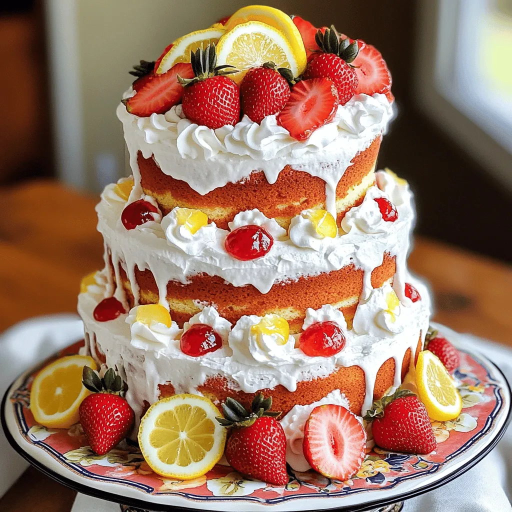 - 2 cups all-purpose flour - 1 ½ cups granulated sugar - ½ cup unsalted butter (softened) - 1 cup buttermilk (preferably room temperature) - 3 large eggs (room temperature) - 2 tablespoons fresh lemon juice - Lemon zest from 1 lemon - 1 teaspoon pure vanilla extract - 2 teaspoons baking powder - ½ teaspoon baking soda - ¼ teaspoon salt - 1 cup fresh strawberries (pureed) - 1 cup heavy cream (chilled) - 2 tablespoons powdered sugar - Extra strawberries and lemon slices for garnish To create the perfect Strawberry Lemonade Layer Cake, gather your ingredients first. This helps keep your kitchen organized. Fresh strawberries will give your cake a bright flavor. Use ripe strawberries for the best taste. Make sure your eggs and buttermilk are at room temperature. This helps them mix well with the other ingredients. - Electric mixer - Mixing bowls - Measuring cups and spoons - 3 8-inch round cake pans - Wire racks Having the right tools makes baking easier. An electric mixer saves time and effort when creaming butter and sugar. Use mixing bowls for separate tasks. Measuring cups and spoons help you get the ingredient amounts just right. The three 8-inch round pans allow even baking. Lastly, wire racks cool your cakes quickly. - Ensure all ingredients are at room temperature for better mixing. - Measure the flour correctly for accurate results. Following these tips will make your cake light and fluffy. Room temperature ingredients blend more smoothly. Accurate measuring, especially for flour, ensures the right texture. Too much flour can make your cake dense. For best results, always follow these simple steps before you start mixing. For the full recipe, check out the [Full Recipe]. Preheat your oven to 350°F (175°C). Grease and flour three 8-inch round cake pans. This step is key to help the cakes come out easily after baking. In a large bowl, beat the softened butter and granulated sugar. Use an electric mixer at medium speed. Mix for about 3-4 minutes until the mixture looks light and fluffy. This adds air for a soft cake. Add the eggs one by one to the butter-sugar mix. Beat well after each egg. Then add the buttermilk, lemon juice, lemon zest, and vanilla extract. Mix until everything is well combined. In a separate bowl, whisk together the flour, baking powder, baking soda, and salt. Gradually add the dry ingredients to the wet mix. Use low speed on your mixer or a spatula. Mix just until combined—don’t overmix! This keeps the cake light. Now, carefully fold in the strawberry puree, ensuring it's evenly mixed without overworking the batter. Divide the batter evenly among the prepared pans. Smooth the tops with a spatula. Bake for 25-30 minutes. A toothpick inserted in the center should come out clean. Once baked, let the cakes cool in the pans for 10 minutes. Then gently turn them out onto wire racks to cool completely. While the cakes cool, whip the chilled heavy cream with powdered sugar until stiff peaks form. This takes about 3-5 minutes with an electric mixer. Once the cake layers are cool, place the first layer on a serving plate. Spread whipped cream on top and add fresh sliced strawberries. Repeat with the second layer. Place the third layer on top and cover the whole cake with the remaining whipped cream. For a lovely finish, decorate the top with extra fresh strawberries and lemon slices. Arrange them nicely to make your cake pop. Remember, you can find the Full Recipe for more detailed steps and tips! To get the best cake texture, avoid overmixing. When you mix the batter, do it just until everything blends. Overmixing can make your cake dense and tough. Keep it light and airy for that perfect bite. Always use fresh lemons and strawberries. Fresh fruit gives the cake a bright, zesty taste. The flavors pop and make every slice a treat. If you can, pick your strawberries just before using them for the best flavor. For a stunning look, add extra fruit on top. Place slices of fresh strawberries and lemons for color. You can also use edible flowers for a unique touch. These decorations not only look great; they also boost the flavor. Get creative with your design to make your cake stand out! {{image_4}} You can change the berries in this cake. Try using raspberries or blueberries. Each berry gives a unique taste and color. Raspberries add a tart flavor, while blueberries give a sweet twist. This allows you to create your own version of the Strawberry Lemonade Layer Cake. You can mix and match berries for fun. If you want a different frosting, look no further than cream cheese frosting. It adds a rich flavor that pairs well with the cake. You could also try a lemon glaze for a light finish. Both options bring their own charm. They can brighten the taste and make the cake even more special. Do you need a gluten-free option? Simply swap all-purpose flour for gluten-free flour. This keeps the cake just as tasty. Make sure to choose a good gluten-free mix. This way, everyone can enjoy the Strawberry Lemonade Layer Cake. You won’t miss the gluten at all! For the full recipe, check out the details above. After enjoying your Strawberry Lemonade Layer Cake, store any leftovers in an airtight container. This keeps the cake fresh and moist. You can keep it in the refrigerator for up to 3 days. Just make sure the container is sealed tightly. This way, you can enjoy your cake later without losing any flavor. If you want to save the cake for a longer time, you can freeze it. First, wrap each cake layer in plastic wrap. This prevents freezer burn and keeps the cake safe. You can freeze the layers for up to 2 months. When you're ready to enjoy, just take them out of the freezer. Thawing the cake is easy. Simply move the wrapped layers to the fridge the night before you want to serve them. This slow thawing method helps retain moisture. It’s best to let them sit in the fridge overnight. When ready, the cake will be soft, tasty, and ready to impress your guests. Yes, prepare and freeze l