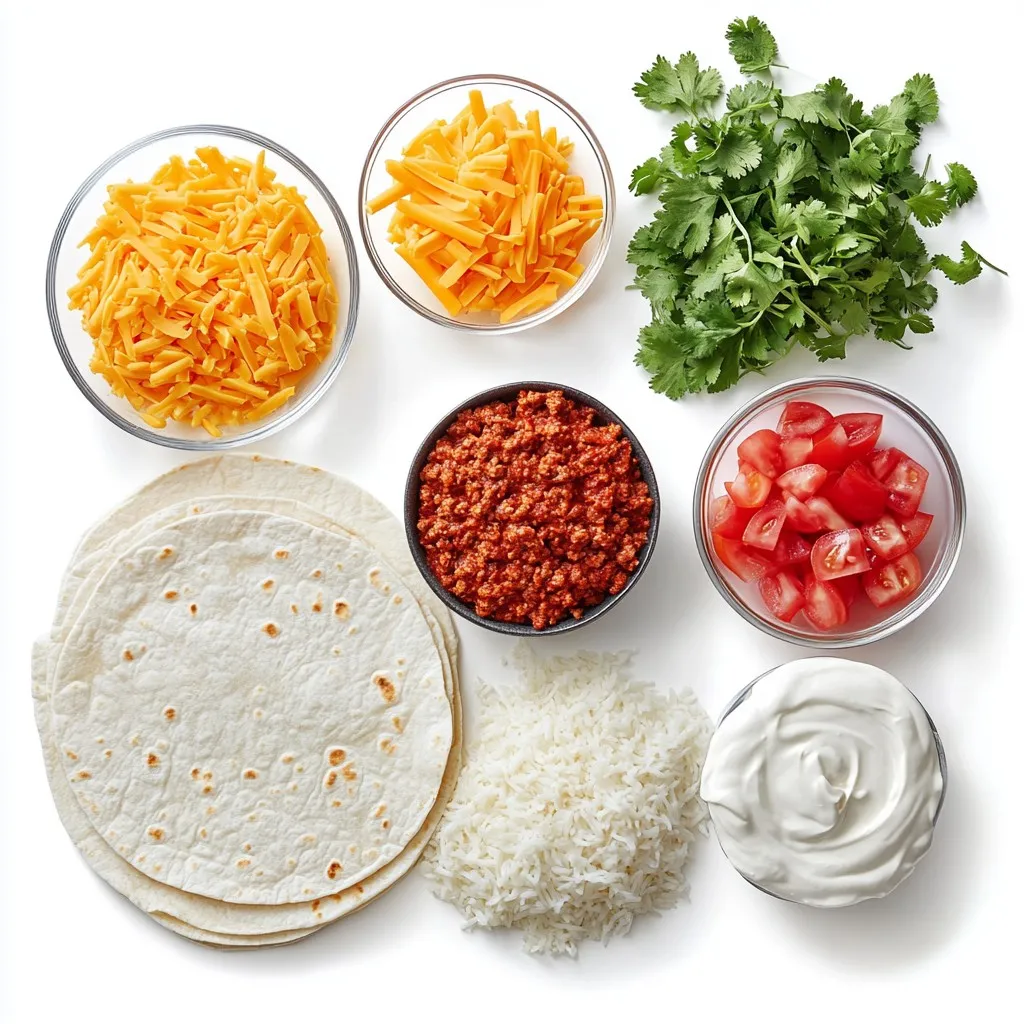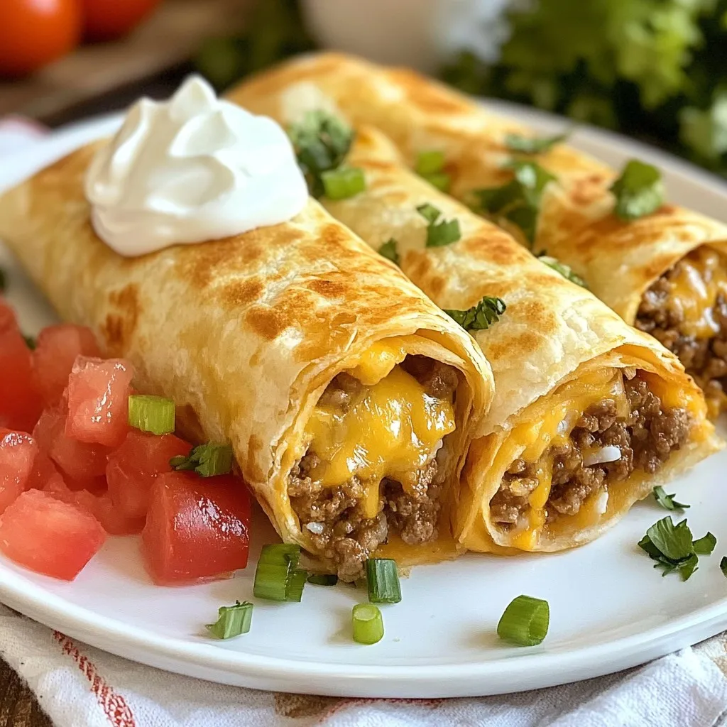 - 1 lb ground beef - 1 packet taco seasoning - 1/2 cup water - 2 cups cooked white rice - 1 cup shredded cheddar cheese - 1 cup nacho cheese sauce - 4 large flour tortillas - 1/2 cup sour cream - 1/4 cup diced tomatoes - 1/4 cup sliced green onions - 1/4 cup cilantro, chopped (optional) - Salt and pepper to taste You can swap the ground beef for ground turkey or chicken. This change cuts down fat but keeps taste. Use brown rice instead of white for added fiber. If you want a creamier texture, try Greek yogurt instead of sour cream. You can also replace nacho cheese with queso dip for a fun twist. If you prefer a vegetarian option, use black beans or lentils for protein. To make this tasty burrito, you need some basic kitchen tools: - Large skillet - Mixing bowl - Spatula - Measuring cups - Cutting board - Knife - Clean surface for assembling burritos - Optional: Skillet for crisping burritos These tools help you prepare and enjoy your Beefy Melt Burrito with ease. {{ingredient_image_2}} Start by heating a large skillet over medium heat. Add 1 pound of ground beef. Cook it for about 6 to 8 minutes. Use a spatula to break the meat into small pieces. When the beef is brown, drain any excess fat. Next, pour in a packet of taco seasoning and 1/2 cup of water. Stir well and let it simmer for 5 minutes. This helps the flavors mix and thicken the sauce. Taste it and add salt and pepper if you want more flavor. In a large bowl, mix 2 cups of cooked white rice with the beef mixture. Add 1 cup of shredded cheddar cheese and 1 cup of nacho cheese sauce. Stir it all together until everything is combined well. The cheese will melt slightly, making the filling creamy and delicious. Warm 4 large flour tortillas in a dry skillet for 10 to 15 seconds on each side. You can also microwave them for 15 to 20 seconds. This makes them easy to fold. Take one warm tortilla and lay it flat. Spoon a generous amount of the beef and rice filling down the center. Add a dollop of sour cream, some diced tomatoes, sliced green onions, and chopped cilantro if you like. After filling each tortilla, fold the sides in and roll it up tightly from the bottom. Heat a skillet over medium heat. Place the burritos seam-side down in the skillet. Cook them for 2 to 3 minutes until they turn golden brown. Flip the burritos and cook for another 2 to 3 minutes. This gives them a nice, crispy texture. Enjoy your Beefy Melt Burrito! To get the best flavor in your Beefy Melt Burrito, use taco seasoning. This seasoning packs a punch. Mix it with the beef and water to boost taste. Let the mixture simmer until thick. This step helps deepen the flavor. You can also add a pinch of salt and pepper for balance. For more zest, consider adding a squeeze of lime juice or a dash of hot sauce. Texture matters in a great burrito. Start by browning the beef well. This gives a nice texture and flavor. Drain excess fat to avoid greasiness. When you mix in the rice and cheeses, stir until combined. This makes each bite creamy and satisfying. Warm the tortillas well to keep them soft. This prevents tearing when you fill and roll them. Finally, crisp the burritos in a skillet. This adds a fun crunch to each bite. Presentation can make your meal more enjoyable. Serve your burritos with extra nacho cheese for dipping. It adds flavor and fun. Garnish with chopped cilantro for a fresh look. A colorful plate can enhance the visual appeal. Add sides like fresh avocado or diced tomatoes for extra color. These simple tips can elevate your meal from good to great! Pro Tips Use Lean Ground Beef: Opt for lean ground beef (90% lean or higher) to reduce excess fat and make the burritos healthier without sacrificing flavor. Customize Your Fillings: Feel free to add or substitute ingredients like black beans, corn, or bell peppers for added texture and flavor in your burrito. Don’t Overstuff: Ensure you don’t overfill the tortillas, as this makes rolling them difficult and can lead to spills while cooking. Rest Before Serving: Let the burritos rest for a couple of minutes after cooking. This allows the filling to settle and makes them easier to cut and serve. {{image_4}} You can easily make a vegetarian or vegan Beefy Melt Burrito. Instead of ground beef, use black beans, lentils, or crumbled tofu. These options provide protein and texture. For cheese, choose dairy-free cheese or skip it altogether. Use guacamole or avocado for creaminess. You can also add extra veggies like corn or bell peppers for more flavor and crunch. Cheese makes a big difference in flavor. Besides cheddar, try Monterey Jack or pepper jack for a spicy kick. You can also use a blend of cheeses for a unique taste. If you want something different, consider using queso fresco or feta. Just remember, fresh cheese melts differently, so adjust your cooking time. Feel free to add your favorite toppings to the burrito. Some great options include: - Sliced jalapeños for heat - Fresh salsa for zest - Avocado slices for creaminess - Crunchy lettuce for freshness Mix and match according to your taste. This way, each burrito can be unique and exciting for everyone at the table. To keep your Beefy Melt Burrito fresh, store it in an airtight container. If you have leftovers, let the burritos cool first. Wrap each burrito in plastic wrap or foil. This keeps moisture in and prevents them from drying out. You can store them in the fridge for up to three days. When you're ready to enjoy your burrito again, there are a few easy ways to reheat it. The best method is using a skillet. Heat the skillet over medium heat. Place the burrito in the skillet for about 2-3 minutes on each side. This keeps it crispy. You can also use the microwave. Wrap the burrito in a damp paper towel and heat for about 30-60 seconds. Check if it’s warm, and if not, add more time. If you want to save your burritos for later, freezing is a great option. Wrap each burrito tightly in foil or plastic wrap. Place them in a freezer-safe bag. The
