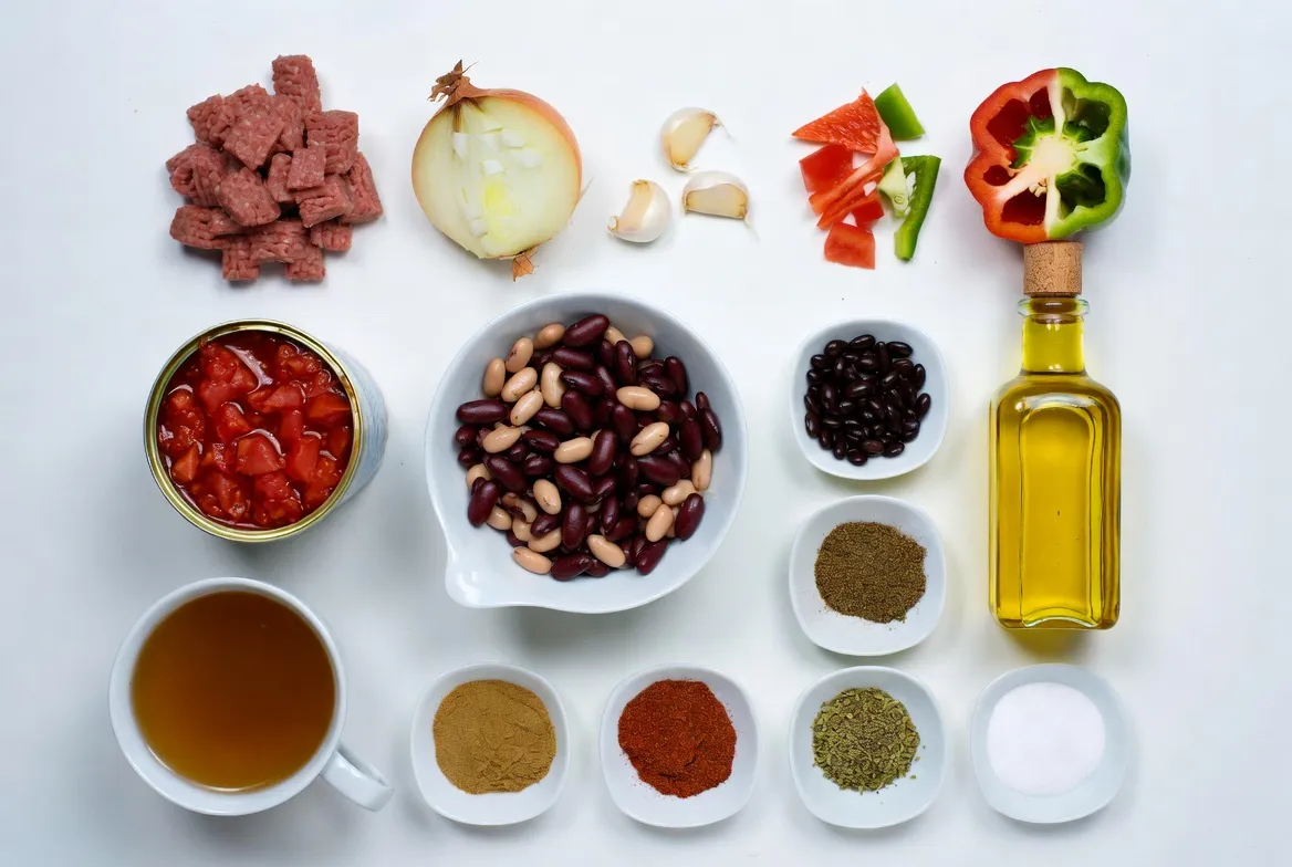 The main ingredients create the base of the chili. Ground beef gives it richness. If you prefer plant-based, use lentils or tofu. Diced onion and bell pepper add sweetness and crunch. Garlic boosts flavor and aroma. Canned tomatoes provide moisture and acidity. Kidney and black beans add heartiness and protein.