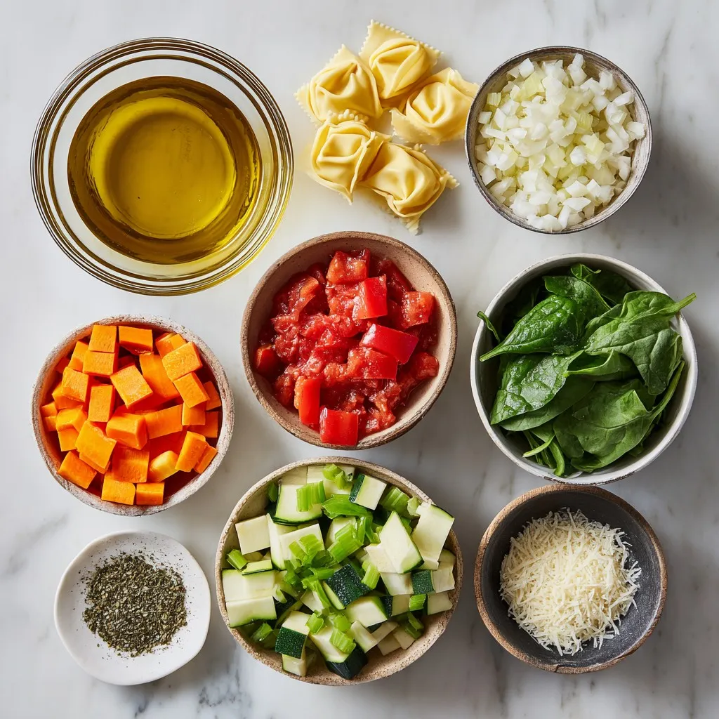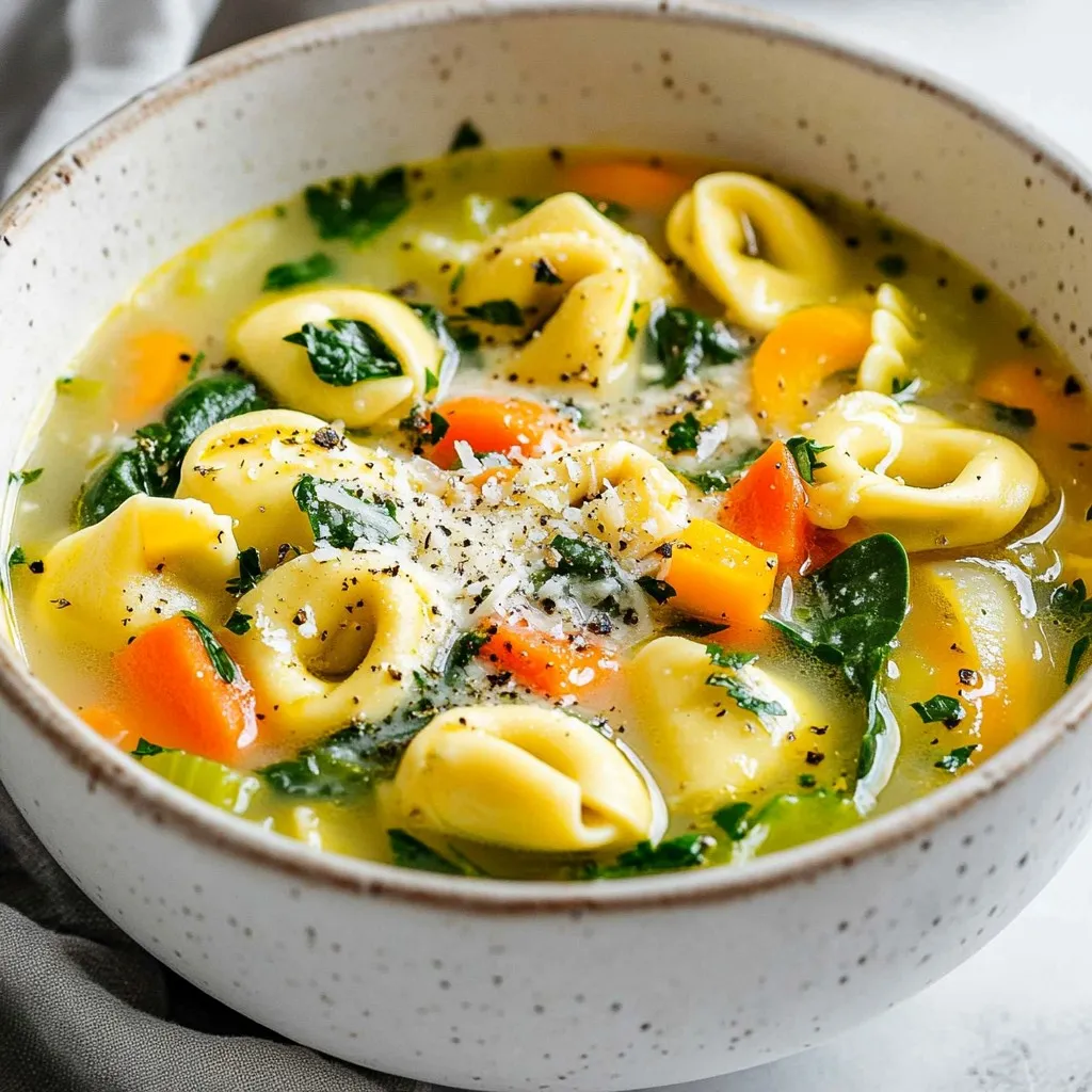 - 2 tablespoons olive oil - 1 medium onion, diced - 2 cloves garlic, minced - 2 carrots, diced - 2 celery stalks, diced - 1 zucchini, diced - 1 bell pepper (red or yellow), diced - 6 cups vegetable broth - 1 can (14.5 oz) diced tomatoes, undrained - 1 teaspoon dried Italian herbs (oregano, basil, thyme) - 1 package (9 oz) fresh cheese tortellini - 2 cups fresh spinach - Salt and pepper to taste - Grated Parmesan cheese for serving (optional) This recipe serves 4 to 6 people. You can adjust the amount based on your needs. If you want a smaller batch, simply cut the ingredients in half. For a larger crowd, double them. Using high-quality ingredients makes a big difference. Choose fresh, crisp vegetables. Look for firm tortellini with a good amount of filling. Fresh herbs add a nice touch, but dried herbs work too. If you can, use low-sodium vegetable broth. This helps you control the salt. Lastly, use real Parmesan for the best flavor. Grated cheese adds a lovely finish to the soup. {{ingredient_image_2}} 1. Start by gathering all your ingredients. You will need olive oil, onion, garlic, carrots, celery, zucchini, bell pepper, vegetable broth, tomatoes, herbs, tortellini, and spinach. 2. Dice the onion, garlic, carrots, celery, zucchini, and bell pepper into small pieces. This helps them cook evenly. 3. Measure out the vegetable broth and set aside the tomatoes and herbs. 1. Heat 2 tablespoons of olive oil in a large pot over medium heat. 2. Add the diced onion and sauté for 3-4 minutes until it’s soft and clear. 3. Stir in 2 cloves of minced garlic, along with the diced carrots and celery. Cook for 5 minutes, stirring often. 4. Add the diced zucchini and bell pepper next. Sauté for 5 more minutes, until they soften. 5. Pour in 6 cups of vegetable broth and add the undrained diced tomatoes. Stir in 1 teaspoon of dried Italian herbs. 6. Bring the mixture to a boil. Once boiling, lower the heat to let it simmer for 10 minutes. 7. Add the fresh tortellini to the pot. Cook them according to the package instructions, usually 3-5 minutes. 8. After cooking, stir in 2 cups of fresh spinach. Let it wilt for about 2 minutes. 9. Taste the soup and add salt and pepper to your liking. - When sautéing veggies, keep an eye on them. Stir often to avoid burning. - If you want a richer flavor, let the soup simmer a little longer. - For the tortellini, follow the package time closely. Overcooking makes them mushy. - Add spinach at the end to keep it bright and fresh. - For a lovely finish, top with grated Parmesan cheese just before serving. To get the best flavor in your soup, start with fresh ingredients. Use good-quality olive oil; it adds depth. Sauté onions until soft, as this builds a strong base. Add garlic just before the other veggies to keep its flavor bright. Mixing dried herbs at the beginning allows them to bloom in the hot broth. Always taste as you go. Adjust salt and pepper to enhance your soup’s taste. One common mistake is overcooking the tortellini. Follow package instructions closely; they can become mushy if left too long. Another mistake is neglecting to season early. If you wait until the end, flavors won’t meld well. Also, don’t skip the spinach; it adds freshness and nutrients. Lastly, avoid using low-quality broth, as it significantly affects the final taste. Serve your soup hot in rustic bowls for a cozy feel. Sprinkle freshly grated Parmesan cheese on top for a rich finish. A drizzle of high-quality olive oil adds a gourmet touch. Pair the soup with crusty bread for a hearty meal. For a fun twist, consider adding a side salad with citrus dressing. This enhances flavors and adds a refreshing crunch. Pro Tips Fresh Ingredients Matter: Using fresh vegetables and herbs will significantly enhance the flavor of your soup, making it more vibrant and delicious. Don’t Overcook the Tortellini: Keep an eye on the cooking time for the tortellini; overcooking can make them mushy. Aim for al dente for the best texture. Enhance with Seasoning: Taste your soup before serving and adjust the seasoning with salt, pepper, or additional herbs as needed. This final adjustment can elevate the dish. Pair with the Right Side: Serve with crusty bread or a fresh salad to complement the soup and create a satisfying meal. {{image_4}} You can switch up the tortellini. Try using spinach or mushroom tortellini. These add unique flavors. You can also use different beans, like chickpeas or white beans, for extra protein. Mix in some fresh herbs, like parsley or basil, for a fresh taste. If you want a kick, add diced jalapeños or crushed red pepper flakes. While vegetable broth is great, you can use mushroom broth for a deeper flavor. If you want a richer taste, use low-sodium chicken broth. You can even make your own broth from vegetable scraps. This adds a personal touch and reduces waste. Use seasonal veggies for the best taste. In spring, add peas and asparagus. Summer is perfect for ripe tomatoes and fresh corn. In fall, try butternut squash and kale. In winter, root vegetables like parsnips or turnips work nicely. Adjust your soup to what is fresh and tasty. This keeps the soup exciting with each season. To store leftovers, let the soup cool down first. Then, transfer it into an airtight container. You can keep it in the fridge for up to three days. Make sure the lid seals well to keep the soup fresh. When you are ready to enjoy your soup again, pour it into a pot. Heat it over medium-low heat. Stir often to prevent sticking. If the soup seems thick, add a splash of vegetable broth or water. Heat until it is warm throughout. If you want to freeze your soup, use a freezer-safe container. Leave some space at the top for expansion. The soup can last in the freezer for up to three months. When ready to eat, thaw it in the fridge overnight. Reheat it on the stove as mentioned above. Yes, you can make this soup vegan. To do so, skip the Parmesan cheese. Choose a vegan tortellini or make your own usin
